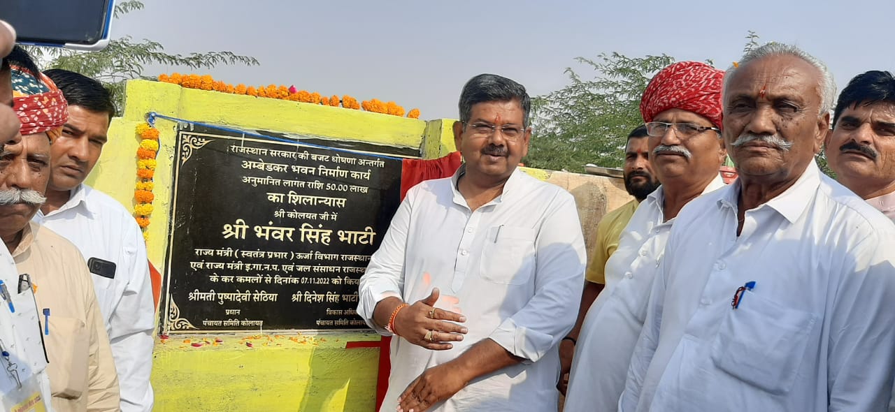 बीकानेर, 7 नवम्बर। श्रीकोलायत मुख्यालय पर शीघ्र ही अंबेडकर भवन बनकर तैयार होगा। ऊर्जा मंत्री श्री भंवर सिंह भाटी ने सोमवार को पंचायत समिति के सामने अंबेडकर भवन निर्माण की आधारशिला रखी। यह भवन मुख्यमंत्री घोषणा के तहत 50 लाख रुपये की लागत से बनाया जाएगा। पंचायत समिति द्वारा अगले तीन माह में इसका निर्माण कार्य पूरा करवा लिया जाएगा।
