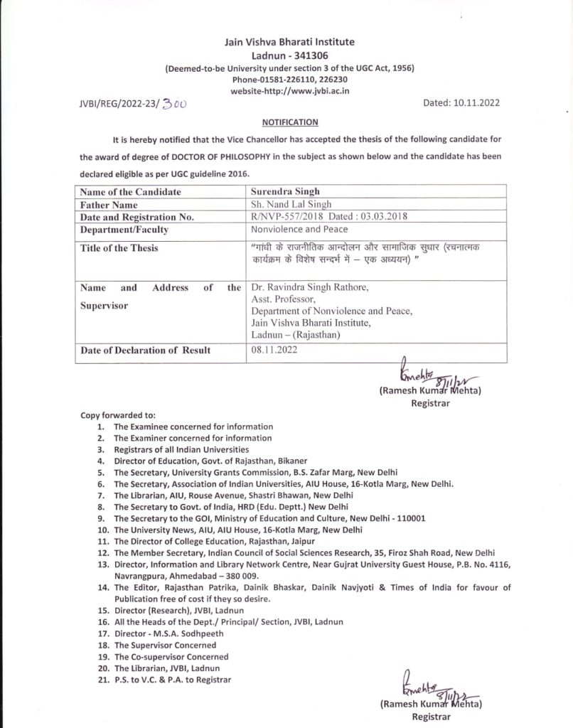 भाजपा नेता और सामाजिक कार्यकर्ता सुरेंद्र सिंह शेखावत को महात्मा गांधी पर किए गए शोध के लिए जैन विश्व भारती लाडनूं द्वारा डॉक्टर ऑफ फिलासफी ( पीएचडी ) की उपाधि प्रदान की गई है।