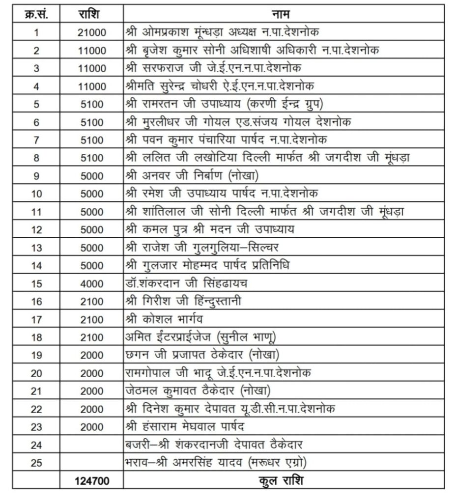 सुरतराम पुत्र खेमाराम नायक के घर पर लगी आग थे नगर पालिका अध्यक्ष ओम प्रकाश ने बताया कि भामाशाह द्वारा उनका मकान बनाया जाएगा जिसमें भूमि पूजन नरसिंहदास महतो द्वारा की गई जिसमें नगर पालिका अध्यक्ष ओम प्रकाश जी पार्षद रमेश कुमार पार्षद प्रतिनिधि ताराचंद जी पार्षद संस्कृतदान महावीर प्रसाद उपस्थित रहे।