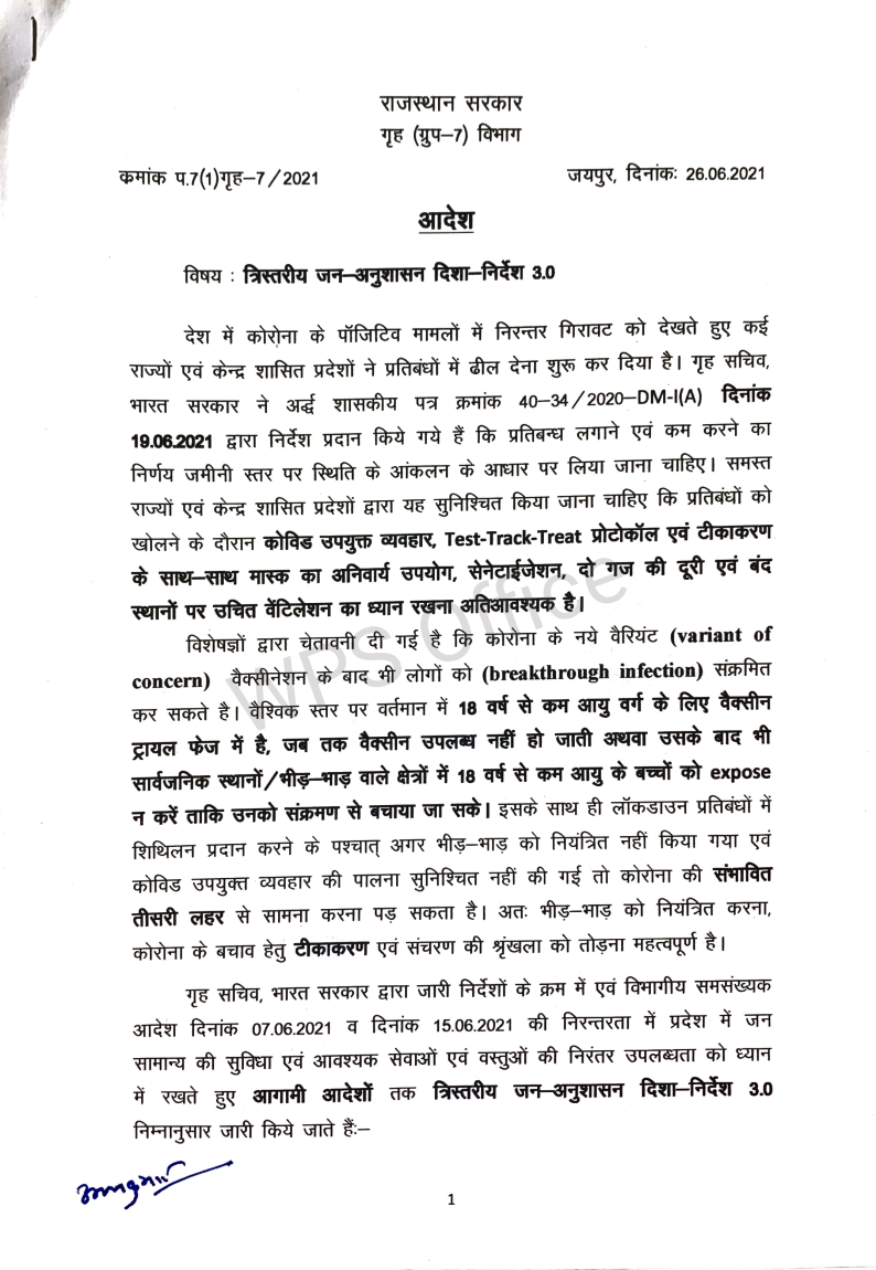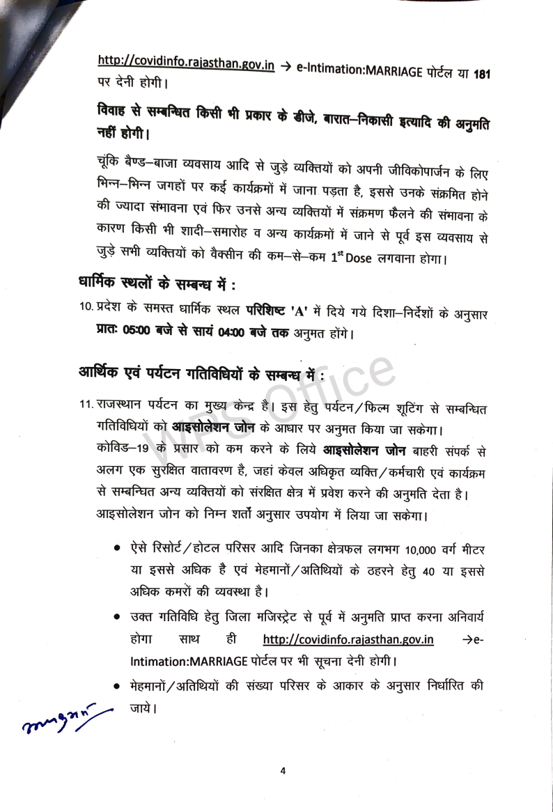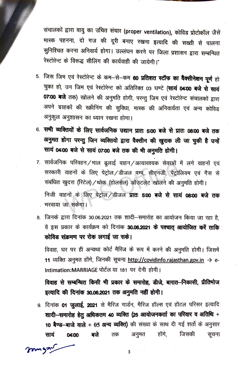*राजस्थान सरकार की नई गाईड लाईन जारी अनलॉक -3 धार्मिक स्थल खोलने की छूट , बाजारों का समय रात 7 बजे तक बढ़ाया**कुछ शर्तो के साथ दी गई छूट,डेल्टा के कारण ऐतिहात बरता जा रहा है**बसे,पेट्रोल पंप , निजी वाहन रात आठ बजे तक चल सकेंगे**1 जुलाई से शादी समारोह की अनुमति, 40 ही लोग शामिल हो सकेंगे**शादी शाम 4 बजे तक ही करनी होगी**सोमवार से होगी नई गाइड लाइन की शर्ते*जयपुर। राजस्थान में कोरोना के लगातार कम होते मामलों को देखते हुए सरकार ने पाबंदियों में कुछ और छूट दी है,लेकिन डेल्टा प्लस के आए एक मामले के बाद सरकार पूरा ऐतिहात बरत रही हैं। जल्दबाजी में कोई कदम नहीं उठाना चाह रही जिससे प्रदेश में फिर हालात बिगडे। बाजार 7 बजे तक खुल सकेंगे,लेकिन उसमें साठ प्रतिशत स्टॉफ वैक्सीनेशन होना जरूरी हैं। रेस्टोरेंटों को सुबह से चार बजे तक ही अपने यहां पचास प्रतिशत की उपस्थिति की छूट रहेगी। पार्क सुबह पांच से आठ खुलेंगे।मुख्यमंत्री अशोक गहलोत में शुक्रवार को हुई राज्य मंत्रिपरिषद की बैठक में दिए गए सुझावों के मद्देनजर प्रदेश में छूट का दायरा बढ़ाते हुए त्रिस्तरीय जन-अनुशासन दिशा-निर्देश 3.0 के तहत विभिन्न गतिविधियों में छूट दी है। इस संबंध में गृह विभाग ने गाइडलाइन जारी कर दी है, जो 28 जून, 2021 सोमवार प्रातः 5 बजे से लागू होगी।गृह विभाग की गाइड लाइन-ऐसे सभी सरकारी कार्यालय जहां कार्मिकों की संख्या 25 से कम है, वहां शत-प्रतिशत कार्मिक एवं जिन कार्यालयों में कार्मिकों की संख्या 25 या 25 से अधिक है, उनमें 50 प्रतिषत कार्मिक अनुमत होंगे। ऐसे कार्यालय जिनमें 60 प्रतिशत कार्मिकों को वैक्सीन की प्रथम डोज लग चुकी है, उनमें शत-प्रतिशत कार्मिक अनुमत होंगे। कार्यालयों का समय प्रातः 9ः30 से सायं 6 बजे तक रहेगा। -विभागाध्यक्ष गर्भवती महिलाओं, विकलांग एवं को-माॅरबिडिटी स्थिति वाले कार्मिकोें को वर्क फ्राॅम होम की अनुमति दे सकेंगे।-शहर में संचालित सिटी/मिनी बसों का संचालन प्रातः 5 से सायं 8 बजे तक अनुमत होगा। किसी भी यात्री को खड़े होकर यात्रा करने की अनुमति नहीं होगी।-शहर में संचालित सिटी/मिनी बसों का संचालन चालक एवं परिचालक द्वारा वैक्सीन की कम से कम पहली डोज लगवाने के बाद प्रारम्भ होगा।-निजी वाहनों से आवागमन प्रातः 5 से सायं 8 बजे तक सोमवार से शनिवार अनुमत होगा।-सभी व्यक्तियों के लिए सार्वजनिक उद्यान प्रातः 5 से प्रातः 8 बजे खुल सकेंगे। जिन व्यक्तियों ने वैक्सीन की डोज लगवा ली है, उन्हें सायं 4 से सायं 7 बजे तक की भी अनुमति होगी।-जिन जिम एवं रेस्टोरेन्ट के कम-से-कम 60 प्रतिशत स्टाफ का वैक्सीनेशन पूर्ण हो चुका है, उन्हें अतिरिक्त 3 घंटे यानि सायं 4 से सायं 7 बजे तक खोलने की अनुमति होगी। ऐसे जिम एवं रेस्टोरेन्ट संचालकों को ग्राहकों की स्क्रीनि