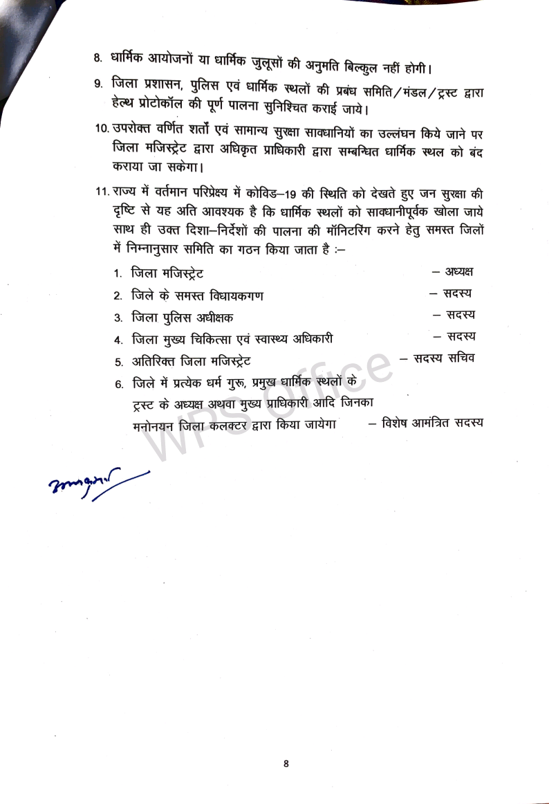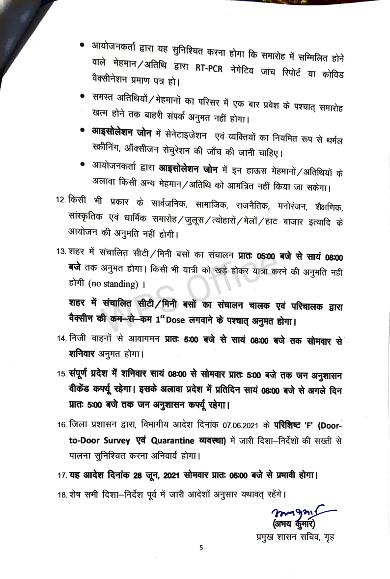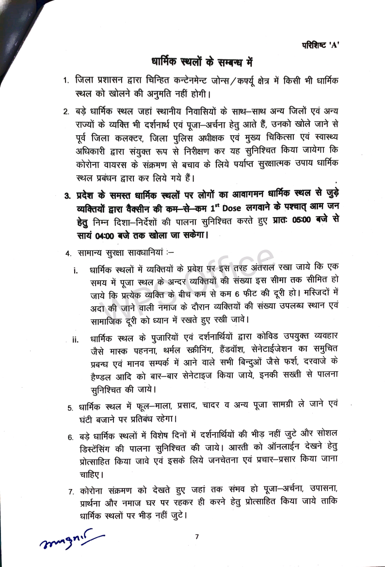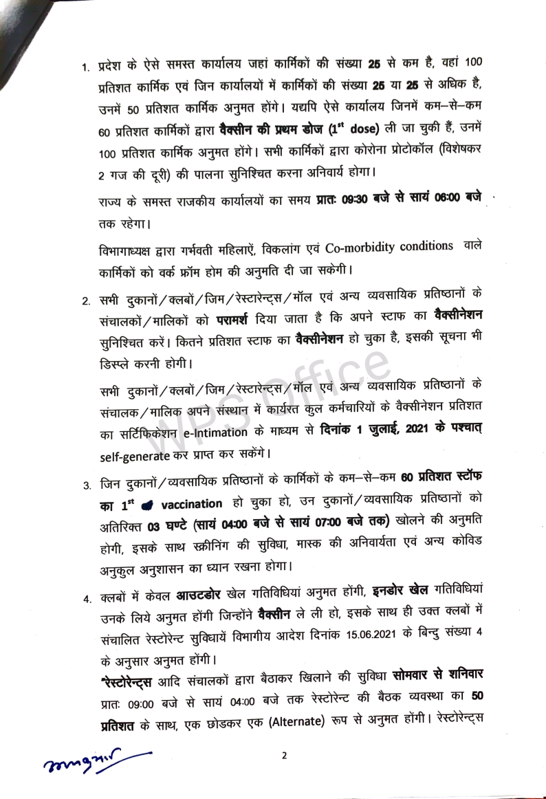 *राजस्थान सरकार की नई गाईड लाईन जारी अनलॉक -3 धार्मिक स्थल खोलने की छूट , बाजारों का समय रात 7 बजे तक बढ़ाया**कुछ शर्तो के साथ दी गई छूट,डेल्टा के कारण ऐतिहात बरता जा रहा है**बसे,पेट्रोल पंप , निजी वाहन रात आठ बजे तक चल सकेंगे**1 जुलाई से शादी समारोह की अनुमति, 40 ही लोग शामिल हो सकेंगे**शादी शाम 4 बजे तक ही करनी होगी**सोमवार से होगी नई गाइड लाइन की शर्ते*जयपुर। राजस्थान में कोरोना के लगातार कम होते मामलों को देखते हुए सरकार ने पाबंदियों में कुछ और छूट दी है,लेकिन डेल्टा प्लस के आए एक मामले के बाद सरकार पूरा ऐतिहात बरत रही हैं। जल्दबाजी में कोई कदम नहीं उठाना चाह रही जिससे प्रदेश में फिर हालात बिगडे। बाजार 7 बजे तक खुल सकेंगे,लेकिन उसमें साठ प्रतिशत स्टॉफ वैक्सीनेशन होना जरूरी हैं। रेस्टोरेंटों को सुबह से चार बजे तक ही अपने यहां पचास प्रतिशत की उपस्थिति की छूट रहेगी। पार्क सुबह पांच से आठ खुलेंगे।मुख्यमंत्री अशोक गहलोत में शुक्रवार को हुई राज्य मंत्रिपरिषद की बैठक में दिए गए सुझावों के मद्देनजर प्रदेश में छूट का दायरा बढ़ाते हुए त्रिस्तरीय जन-अनुशासन दिशा-निर्देश 3.0 के तहत विभिन्न गतिविधियों में छूट दी है। इस संबंध में गृह विभाग ने गाइडलाइन जारी कर दी है, जो 28 जून, 2021 सोमवार प्रातः 5 बजे से लागू होगी।गृह विभाग की गाइड लाइन-ऐसे सभी सरकारी कार्यालय जहां कार्मिकों की संख्या 25 से कम है, वहां शत-प्रतिशत कार्मिक एवं जिन कार्यालयों में कार्मिकों की संख्या 25 या 25 से अधिक है, उनमें 50 प्रतिषत कार्मिक अनुमत होंगे। ऐसे कार्यालय जिनमें 60 प्रतिशत कार्मिकों को वैक्सीन की प्रथम डोज लग चुकी है, उनमें शत-प्रतिशत कार्मिक अनुमत होंगे। कार्यालयों का समय प्रातः 9ः30 से सायं 6 बजे तक रहेगा। -विभागाध्यक्ष गर्भवती महिलाओं, विकलांग एवं को-माॅरबिडिटी स्थिति वाले कार्मिकोें को वर्क फ्राॅम होम की अनुमति दे सकेंगे।-शहर में संचालित सिटी/मिनी बसों का संचालन प्रातः 5 से सायं 8 बजे तक अनुमत होगा। किसी भी यात्री को खड़े होकर यात्रा करने की अनुमति नहीं होगी।-शहर में संचालित सिटी/मिनी बसों का संचालन चालक एवं परिचालक द्वारा वैक्सीन की कम से कम पहली डोज लगवाने के बाद प्रारम्भ होगा।-निजी वाहनों से आवागमन प्रातः 5 से सायं 8 बजे तक सोमवार से शनिवार अनुमत होगा।-सभी व्यक्तियों के लिए सार्वजनिक उद्यान प्रातः 5 से प्रातः 8 बजे खुल सकेंगे। जिन व्यक्तियों ने वैक्सीन की डोज लगवा ली है, उन्हें सायं 4 से सायं 7 बजे तक की भी अनुमति होगी।-जिन जिम एवं रेस्टोरेन्ट के कम-से-कम 60 प्रतिशत स्टाफ का वैक्सीनेशन पूर्ण हो चुका है, उन्हें अतिरिक्त 3 घंटे यानि सायं 4 से सायं 7 बजे तक खोलने की अनुमति होगी। ऐसे जिम एवं रेस्टोरेन्ट संचालकों को ग्राहकों की स्क्रीनि