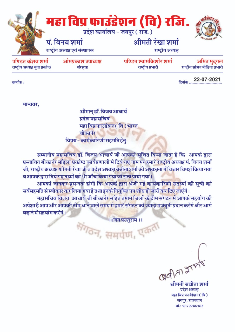 महाविप्र फाउंडेशन बीकानेर महिला कार्यकारिणी की घोषणा