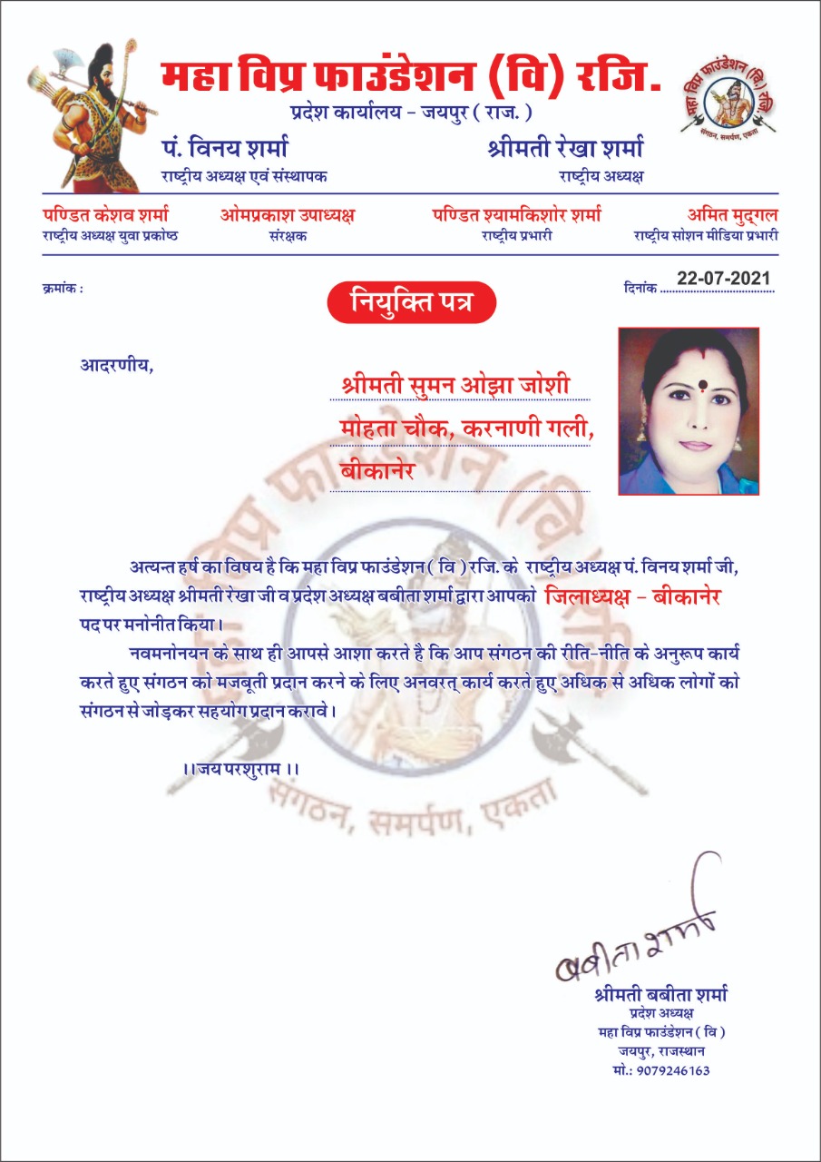 गुरू पूर्णिमा के अवसर पर महाविप्र फाउंडेशन, बीकानेर की महिला कार्यकारिणी की घोषणा प्रदेश महासचिव डॉ. विजय आचार्य की अनुशंषा पर प्रदेश अध्यक्षा बबीता शर्मा ने की है जिसमे सुमन ओझा शहर अध्यक्षा, वीणा आचार्य को महासचिव नियुक्त किया गया है तथा मीना आचार्य को शहर व देहात की जिला संयोजक नियुक्त किया गया है।