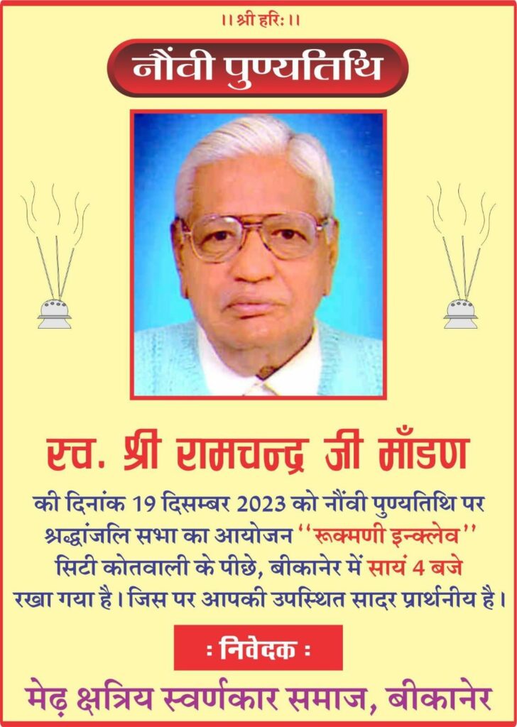 बीकानेर, 18 दिसम्बर। मैढ़ क्षत्रिय स्वर्णकार समाज के मुक्तिधाम (बगीची) मेंं अनेक वर्षों तक निष्काम भाव से सेवा करने वाले समाज सेवी रामचन्द्र सोनी मांडण की नौवीं पुण्य तिथि पर मंगलवार को शाम चार बजे मेढ़ क्षत्रिय स्वर्णकार समाज, की ओर से सिटी कोतवाली के पास स्थित रुक्मणी इन्क्लेव परिसर में श्रद्धांजलि सभा आयोजित की जाएगी।
