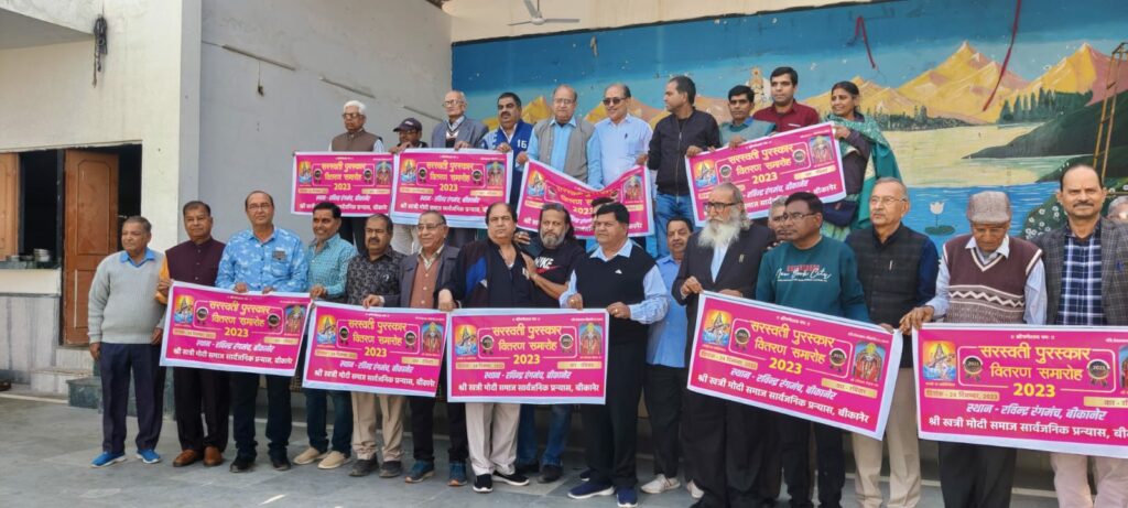 बीकानेर। श्री खत्री मोदी समाज सार्वजनिक प्रन्यास की ओर से 24 दिसम्बर को रविन्द्र रंगमंच में सरस्वती पुरस्कार वितरण समारोह का आयोजन किया जाएगा। जिसमें जिले के साथ प्रदेशभर के सजातिय होनहार विद्यार्थियों का सम्मान किया जाएगा। पत्रकार वार्ता में आयोजन की जानकारी देते हुए प्रन्यास अध्यक्ष श्रीराम अरोड़ा ने बताया कि प्री नर्सरी से लेकर उच्च शिक्षा स्तर पर पैंसठ प्रतिशत से अधिक अंक लाने वाले मेधावी विद्यार्थियों को सम्मानित किया जाएगा। इसके लिये अब तक आठ सौ पचास से ज्यादा आवेदन आ चुके है। इसके लिये जिलेभर में 20 केन्द्र बनाएं गये है। जहां विद्यार्थी अपनी अंकतालिका को जमा करवा सकते है। इसके लिये 22 दिसम्बर को अंतिम तारीख रखी गई है। अरोड़ा ने बताया कि इसके अलावा भी देश विदेश में रहने वाली प्रतिभाओं के प्रतिनिधियों को भी समारोह में सम्मानित किया जाएगा। कार्यक्रम में सभी दलों के जनप्रतिनिधियों व विधायकों को बतौर अतिथि आमंत्रित किया गया है। प्रेस वार्ता में ईश्वर दयाल मोदी,पार्षद शांतिलाल व मदन मोदी उपस्थित रहे। इस दौरान समारोह के पोस्टर का विमोचन पार्षद अंजना खत्री, महेश मोदी,गौरीशंकर खत्री,राजकुमार मोदी,राजनारायण बालेचा,मोहन बालेचा,प्रकाश,पु खराज,ओम मोदी,अजय खत्री,शिवभगवान खत्री,मूलचंद खत्री,बालकिशन,विष्णु गोपाल, भवानीशंकर मोदी,दिनेश लखाणी,मोहनलाल मोदी,मनोज मोदी,अशोक कुमार,संजय कपूर, शिव मोदी,सुशील कुमार,कैलाश चंद्र,नीरज,राजकुमार खत्री,देवेन्द्र खत्री आदि की ओर से किया गया।