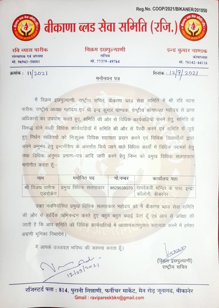 जरूरतमन्द व्यक्तियों के लिए कार्यरत लाइव रक्त सेवा संगठन बीकाणा ब्लड सेवा समिति रजि. के विधिक अनुभाग में प्रमुख विधिक सलाहकार पद पर रविवार को एडवोकेट विजय जी पारीक की नियुक्ति हुई। बीकाणा ब्लड सेवा समिति के राष्ट्रीय सचिव विक्रम इछपुल्याणी ने समिति के राष्ट्रीय अध्यक्ष रवि व्यास जी पारीक और राष्ट्रीय कोषाध्यक्ष इन्द्र कुमार चाण्डक की अनुशंसा पर एडवोकेट महोदय को इस पद पर मनोनित किया।