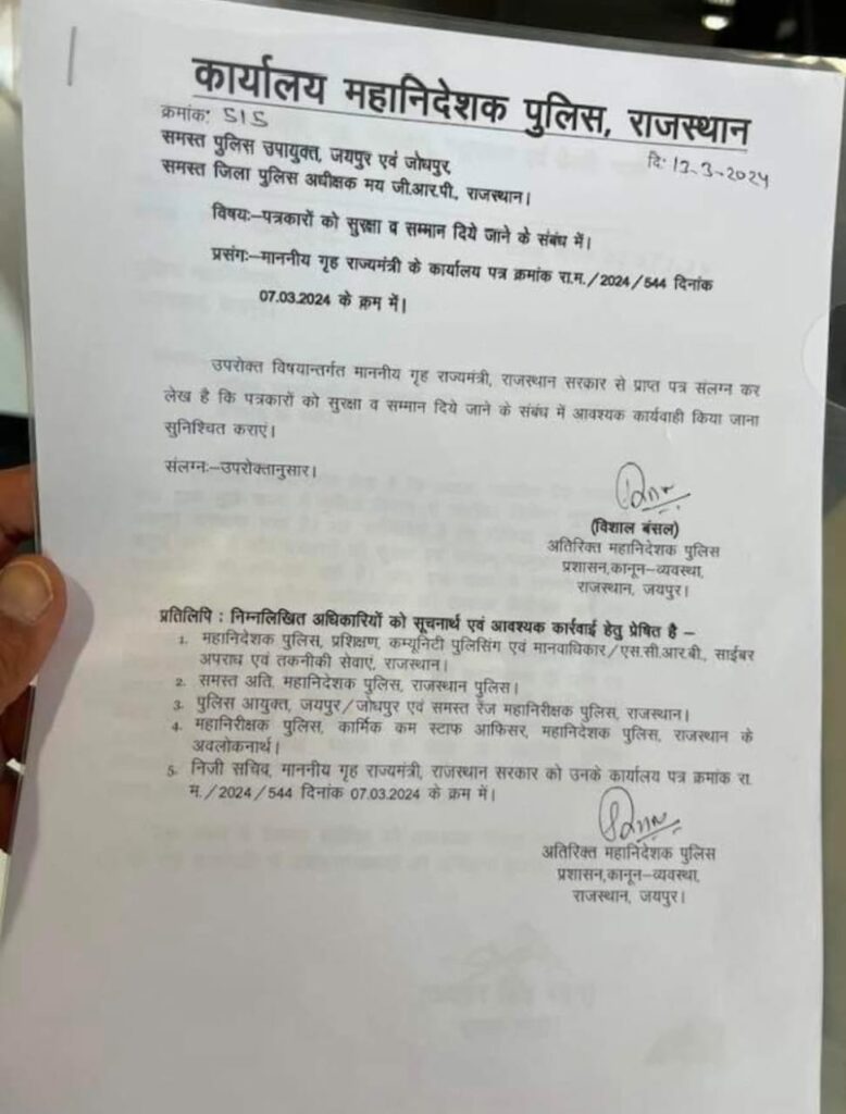 प्रदेश में पत्रकारों को सुरक्षा और सम्मान दिए जाने के लिए पुलिस मुख्यालय की ओर से जयपुर और जोधपुर के पुलिस आयुक्तालय के तहत सभी पुलिस उपायुक्तों सहित अन्य जिलों के जिला पुलिस अधीक्षक मय जीआरपी को दिशा—निर्देश जारी किए गए हैं।