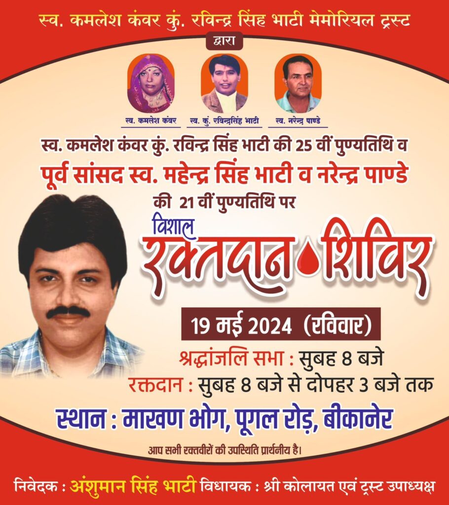 बीकानेर 18 मई । स्व. श्रीमती कमलेश कंवर कुँ रविन्द्रसिंह भाटी मेमोरियल ट्रस्ट, बीकानेर के तत्वावधान में हर वर्ष की भांति इस वर्ष भी 19 मई, 2024 वार रविवार को माखन भोग, पूगल रोड़, बीकानेर में विशाल रक्तदान शिविर एवं श्रृद्धाजलि सभा का आयोजन किया जा रहा है !!