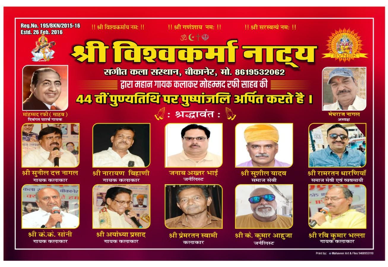 बीकानेर। श्री विश्वकर्मा नाट्य संगीत कला संस्थान के अध्यक्ष मेघराज नागल ने बताया कि हमारी संस्था द्वारा आगामी 31 जुलाई बुधवार को सर्किट हाउस के सामने स्थित महात्मा गांधी पार्क के प्रांगण में सुबह 10 बजे फिल्मी जगत के”शहन्शाहे तरन्नूम स्वर्गीय मो.रफी साहब” की 44 वीं पुण्यतिथि के अवसर पर उनके तेल चित्र तस्वीर पर संस्था के पदाधिकारियों द्वारा पुष्पांजलि कार्यक्रम आयोजित किया जाएगा। कार्यक्रम की शुरुआत में सभी संगीत प्रेमियों द्वारा उनके चित्र पर पुष्प अर्पित कर श्रद्धांजलि पेश करेंगे, जिसमें संस्था के रामरतन धारणिया, सुनील दत्त नागल, कमलकांत सोनी, नारायण बिहाणी,रवि भल्ला, सैय्यद अख्तर, सुशील यादव, अयोध्या प्रसाद शर्मा, प्रेम रतन स्वामी, के. कुमार आहूजा,एनडी कादरी, मुकेश जेवरिया, नंदकिशोर मूंड सहित आदि संगीत से जुड़े लोग मौजूद रहेंगे।