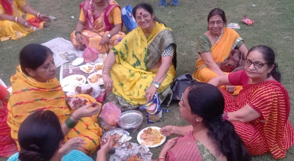 खत्री समाज की सभी सखियां अपने अपने घर से टिफिन में अलग-अलग प्रकार के व्यंजन, भुजिया नमकीन,मिठाइयां,आइस्क्रीम लेकर आए और सभी ने मिलजुल कर एक दूसरे को बांटकर भोजन ग्रहण किया