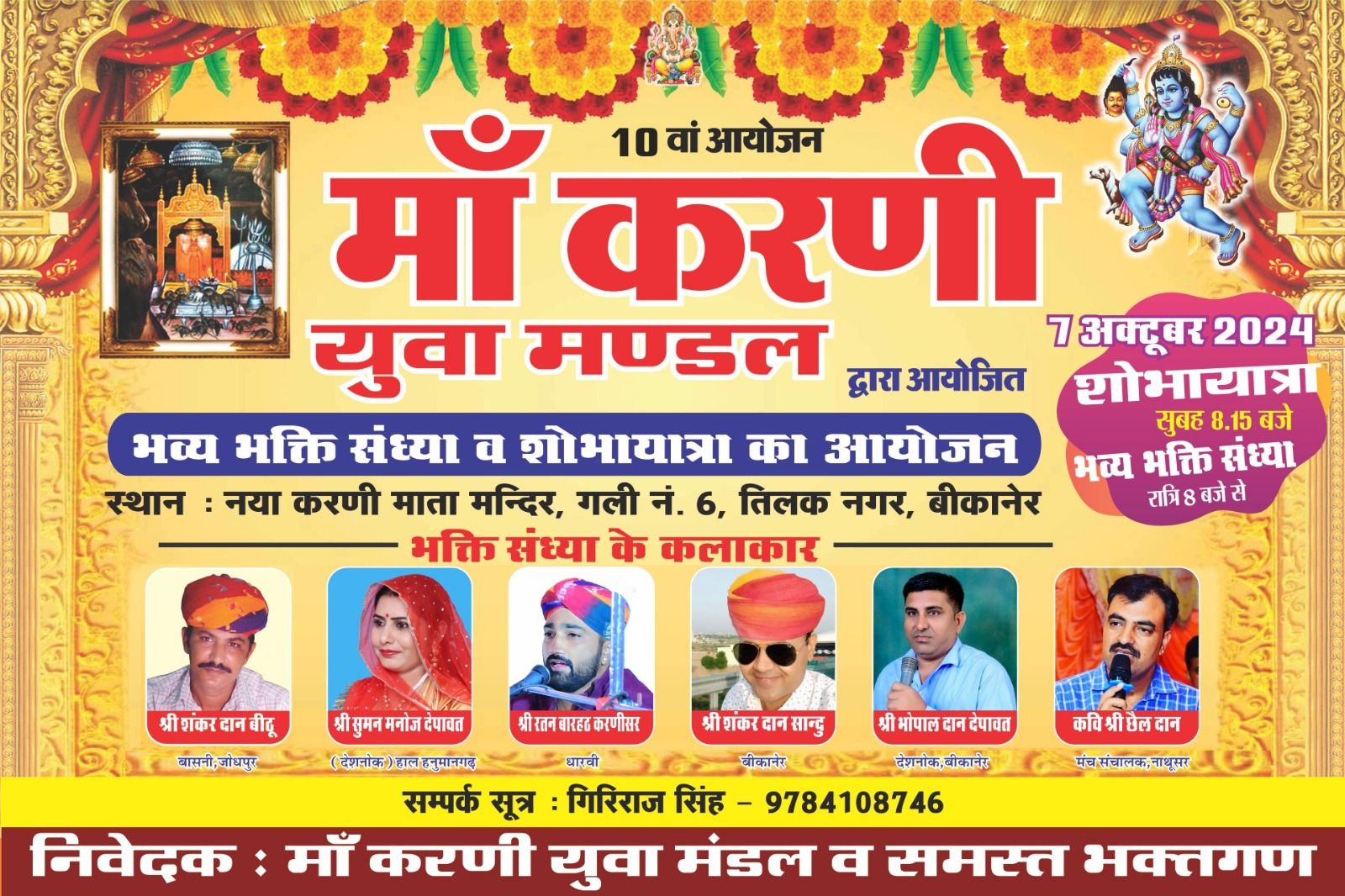 बीकानेर| तिलकनगर के नयेकरणी माता मंदिर में श्री माँ करणी युवा मंडल व तिलकनगर वासियों के तत्वावधान में हर वर्ष लगने वाला विशाल भक्ति संध्या का दसवा आयोजन 7 अक्टूबर को होगा जिसमें राजस्थान के नामचीन चिरजा कलाकर अपनी मधुर वाणी का रस बरसायेंगे ।श्री माँ करणी मंदिर विकास समिति अध्यक्ष गिरिराज सिंह चारण ने बताया कि 7 अक्टूबर को प्रातः 8:15 बजे शोभा यात्रा एवं कन्या भोज तथा रात 8 बजे से प्रातः काल तक भक्ति संध्या होगी!