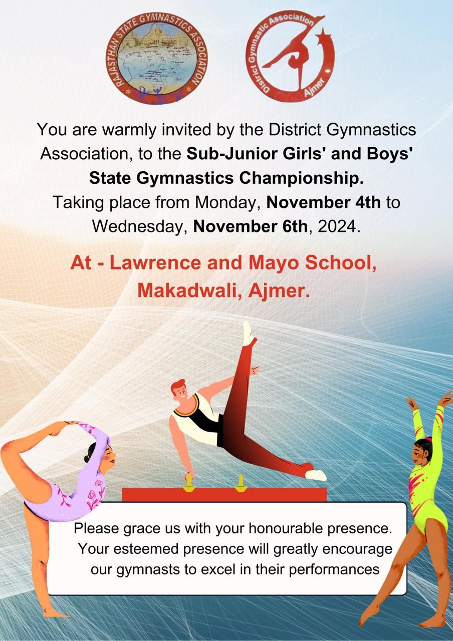 बीकानेर १६/१०/२४ राजस्थान राज्य स्तरीयसब जूनियर जिमनास्टिक्स प्रतियोगिता, लेरीस एंड मेयो पब्लिक स्कूल, अजमेर में दिनांक 4 नवंबर से 6 नवंबर 2024 तक आयोजित होने जा रही है.