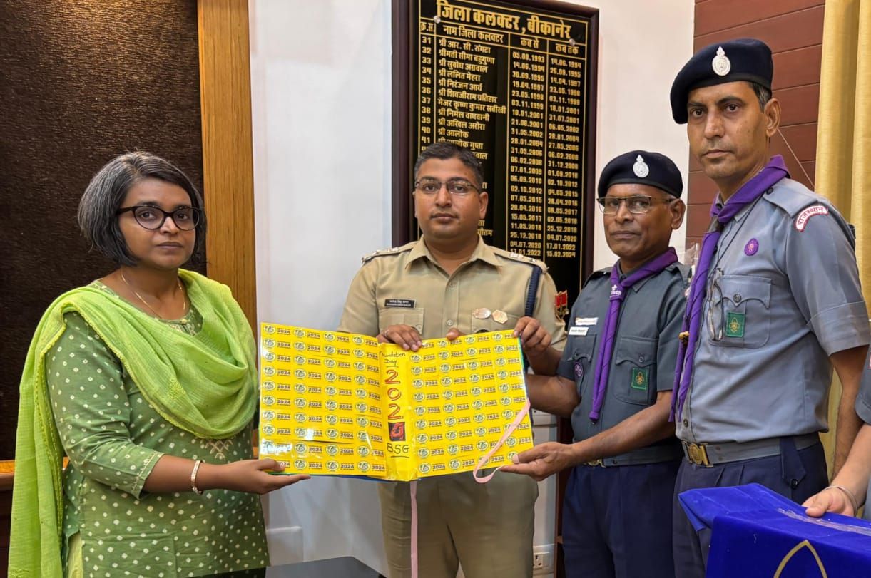 बीकानेर, 7 नवंबर। भारत स्काउट गाइड के 75वें स्थापना दिवस पर जिला कलेक्टर श्रीमती नम्रता वृष्णि एवं पुलिस अधीक्षक श्री कावेंद्र सागर ने गुरुवार को जिला कलेक्टर कार्यालय में स्काउट गाइड के स्टीकर फ्लैग का विमोचन किया।