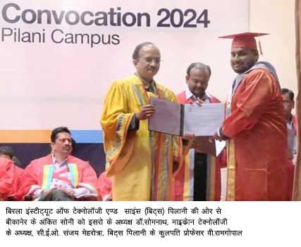बिरला इंस्टीट्यूट ऑफ टेक्नोलॉजी एण्ड साइंस (बिट्स) के 95 वें दीक्षांत समारोह में शिक्षा और अनुसंधान उत्कृष्टता के 60 वर्षों के जश्न में यह उपाधि इसरो के अध्यक्ष डॉ.सोमनाथ, माइ्रक्रेन टेक्नोलॉजी के अध्यक्ष, सी.ई.ओ. संजय मेहरोत्रा, बिट्स पिलानी के कुलपति प्रोफेसर वी.रामगोपाल ने रविवार को की। डॉ. अंकित सोनी गंगाशहर बीकानेर के मैढ़ क्षत्रिय स्वर्णकार समाज के पहले स्वर्णकार है जिन्होंने बिट्स से यह उपाधि प्राप्त की है। डॉ.अंकित ने उपाधि का श्रेय गुरुजनों, दादा इंजीनियर स्वर्गीय शंकर लाल कडे़ल सोनी, दादी परमेश्वरी, पिता दिनेश कड़ेल व माता अनिता को दिया है। उनकी प्रेरणा व प्रोत्साहन से ही यह मुकाम हासिल कर सकें है। श्री हरिद्वार मैढ़ क्षत्रिय स्वर्णकार धर्मशाला के अध्यक्ष चंपालाल डांवर, वरिष्ठ सामाजिक कार्यकर्ता भूरमल सोनी, मैढ़ क्षत्रिय स्वर्णकार भवन के ट्रस्टी गणेश सहदेवड़ा, श्री मैढ़ क्षत्रिय स्वर्णकार समाज ब्लड वॉरियरर्स, श्री युवा स्वर्णकार संस्थान के श्रवण कूकरा, राजेश बुटण, आर्यन सोनी, समाज सेवी विजय राज डांवर, देवकी नंदन व कल्पना, जयपुर के आनंदजी ढल्ला व मीडियाकर्मी शिवकुमार सहदेव ने डॉ. अंकित को शुभकामनाएं दी है।