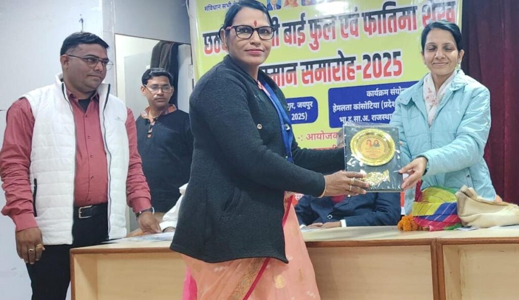 बाबूलाल निर्मल, चून्नीलाल, दानाराम, एड. सतीश जी के हाथों से जयपुर साइंस पैलेस में ज्योतिबा फुले एवं फातिमा सेख की जयंती पर। विशेष उत्कृष्ट सम्मान कमला प्रजापत को दिया गया।