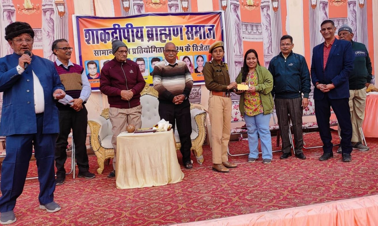शाकद्वीपीय ब्राह्मण समाज सामान्य ज्ञान प्रतियोगिता कमेटी द्वारा शाकद्वीपीय ब्राह्मण समाज के युवाओं के लिये आयोजित सामान्य ज्ञान प्रतियोगिता 2024 के विजेता प्रतियोगियों को श्रीश्यामोजी वंशज मूधाड़ा भोजक प्रन्यास में आयोजित सम्मान समारोह में नकद पुरस्कार व अन्य सामग्री से पुरस्कृत किया गया । कमेटी के आर के शर्मा ने बताया कि पुरस्कार वितरण समारोह के मुख्य अतिथि माणक भोजक सहित संयोजक जेठमल शर्मा, राजेश शर्मा, मदन गोपाल शर्मा, राधेश्याम सेवग, जे के शर्मा, विजयशंकर शर्मा, मनमोहन शर्मा, दुर्गादत्त भोजक, नरेन्द्र शर्मा, अनिल शर्मा शिवकुमार व उप पुलिस निरीक्षक संजू रानी ने पुरस्कृत किया । स्नातक स्तर पर पिंकी शर्मा-प्रथम, गौरव सेवग-द्वितीय व तृतीय रहे रामकुमार शर्मा को, स्नातकोत्तर स्तर पर सुनिता शर्मा-प्रथम, रूचिका शर्मा-द्वितीय व तृतीय स्थान पर रहे अजय कुमार सेवग को और सीनियर स्तर में मिलिंद शर्मा-प्रथम, केशव शर्मा-द्वितीय व तृतीय स्थानर पर रही प्रणिका शर्मा को नकद पुरस्कार से सम्मानित किया गया । प्रथम स्थान पर रहे प्रत्येक वर्ग के तीनों प्रतियोगियों को 4100.00 द्वितीय स्थान के तीनों प्रतियोगियों को 2100.00 व तृतीय स्थान के तीनों प्रतियोगियों को रू 1100.00 रू की नकद राशि व भेंट प्रदान कर सम्मानित किया गया । इनके अलावा 15 विजेता प्रतियोगियों को 151-151 रू का नकद पुरस्कार भी प्रदान किया गया । उल्लेखनीय है कि यह प्रतियोगिता सीनियर, अंडर ग्रेज्यूट व ग्रेज्यूट लेवल के विद्यार्थियों के लिये दो चरणों में परीक्षा आयोजित की गई थी जिसमें 135 से अधिक विद्यार्थियों का पंजीकरण किया गया ।
