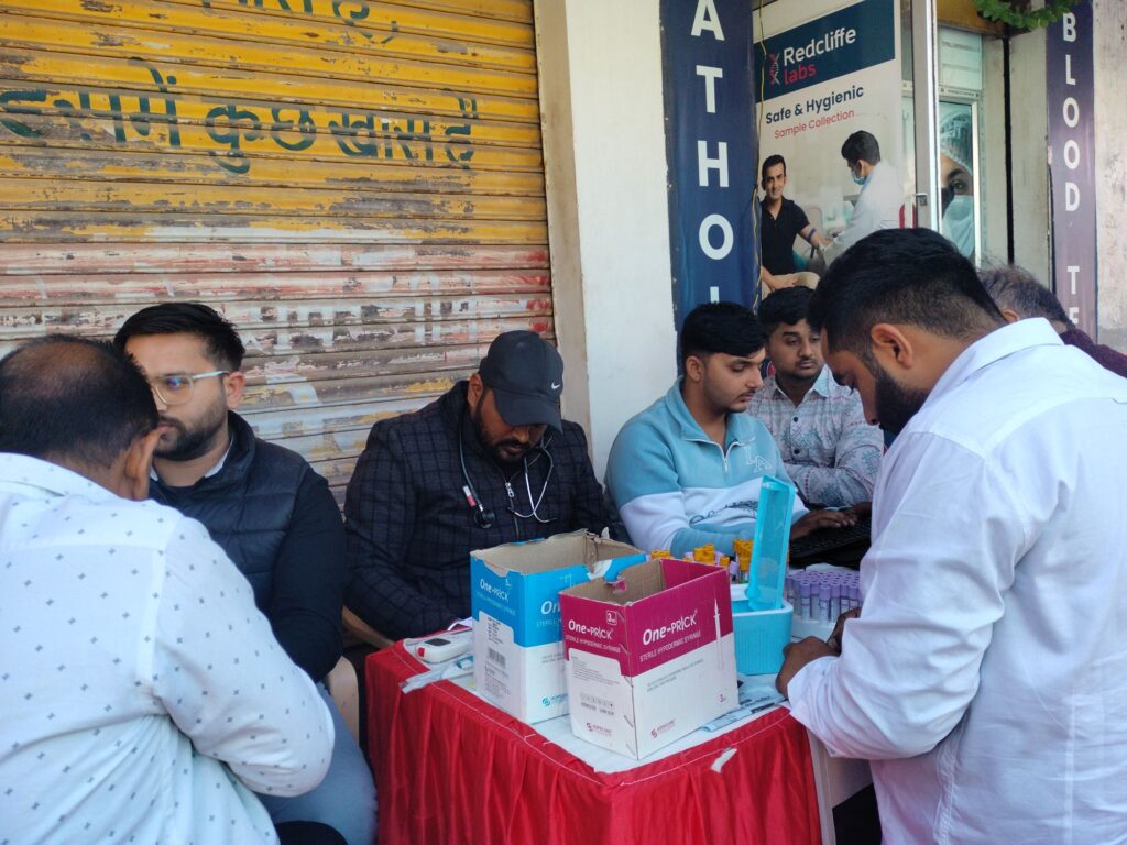 बीकानेर। स्थानीय मुरलीधर कॉलोनी रोड़ पर विवेक बाल मंदिर स्कूल के पास स्थित द्वारकाधीश लैब एंड ब्लड कलेक्शन सेंटर ने अपनी पहली वर्षगांठ पर अनूठा नवाचार करते हुए निशुल्क मेगा जांच शिविर का आयोजन किया। शिविर में 782 जनों ने अपने जांच शिविर का लाभ उठाया। शिविर के मीडिया प्रभारी हर्षित बिस्सा ने बताया कि सुबह 8 बजे से दोपहर 3 बजे तक आयोजित शिविर में सीबीसी,कोलेस्ट्रॉल एवं ब्लड शुगर फास्टिंग,ईसीजी,फेफड़ों की जांच सहित 8 प्रकार की निशुल्क जांच की गई। शिविर में बड़ी संख्या में हर आयु वर्ग के लोग पहुंचे। शिविर संचालक गौरव जोशी ने बताया कि शिविर में उत्सावर्धन करने के लिये भाजयुमो के शहर अध्यक्ष वेद व्यास,देहात अध्यक्ष जसराज सींवर,भाजपा आईटी सैल के विक्रम सिंह राजपुरोहित,रासबिहारी जोशी पहुंचे।