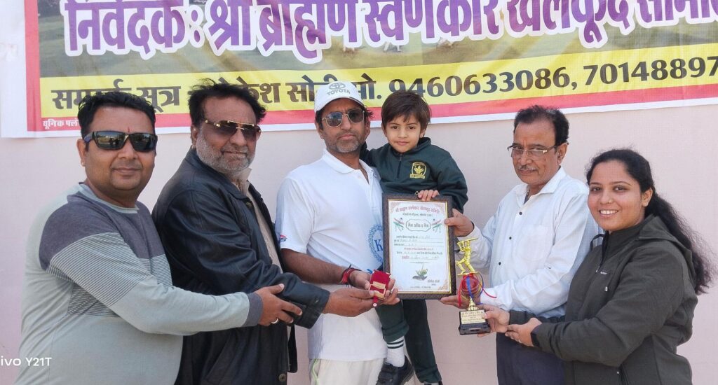 आज के मैच के मुख्य अतिथि स्वर्णलता ट्रेडर्स की अंजिल सोनी और लाल चंद सोनी के हाथों समिति की तरफ से मैन ऑफ़ द मैच का सर्टिफिकेट ट्रॉफी और जय प्रकाश सोनी की तरफ से चांदी का सिक्का दिया गया