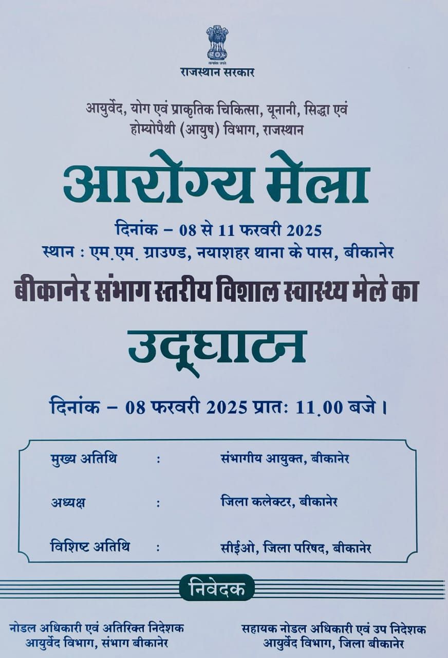 आरोग्य मेले के सहायक नोडल डॉ. प्रभु दयाल जाट ने बताया कि आरोग्य मेला 11 फरवरी तक प्रतिदिन आयोजित होगा।