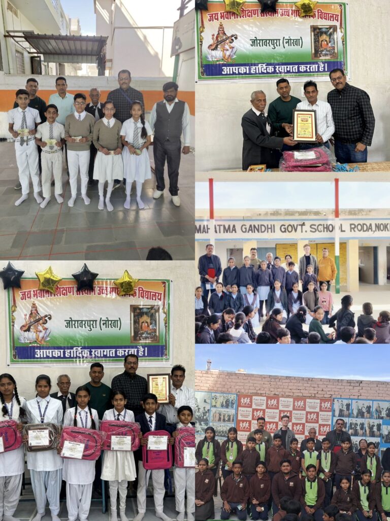 नोखा। मानव प्रबोधन प्रन्यास श्रीलालेश्वर महादेव मंदिर शिवमठ शिवबाड़ी बीकानेर द्वारा आयोजित गीता ज्ञान परीक्षा के तहत गीता स्मरण प्रतियोगिता के पुरस्कार के रूप में 242 विद्यार्थियों को 18840/- रुपए की धनराशि नोखा व रोड़ा के स्कूलों में वितरण किए गए। नोखा प्रभारी पवन चांडक ने बताया कि महात्मा गांधी राजकीय विद्यालय रोड़ा, संस्कार इंटरनेशनल पब्लिक स्कूल, संस्कार विद्या विहार, फर्स्ट स्टेप इंग्लिश स्कूल, जय भवानी शिक्षण संस्थान उच्च माध्यमिक विद्यालय में पुरस्कार वितरण समारोह का आयोजन किया गया। आज जय भवानी शिक्षण संस्थान उच्च माध्यमिक विद्यालय में विद्यार्थियों को पुरस्कार स्वरूप स्कूल बैग, रजिस्टर, कॉपी एवं पेन भी दिए गए। स्कूल को अभिनंदन पत्र एवं गुरुजनों को सम्मान स्वरूप पेन भेंट किए गए। इस अवसर पर नोखा प्रभारी पवन चांडक ने स्कूलों के सभी विद्यार्थियों से अगली बार ज्यादा से ज्यादा संख्या में इस पावन पर्व में सम्मिलित होने को कहा। सभी विद्यार्थियों के चेहरे खुशी से झूम उठे धनराशि प्राप्त करके। इस शुभ अवसर पर गर्भस्थ शिशु संरक्षण समिति शाखा नोखा के इंदरचंद मोदी, रामदयाल गहलोत, धर्मेंद्र गहलोत, यश चांडक सम्मिलित हुए। सभी स्कूलों के प्रधानाध्यापकों ने पवन चांडक को धनराशि व पुरस्कारों लिए मानव प्रबोधन प्रन्यास, श्रीलालेश्वर महादेव मंदिर शिवमठ शिवबाड़ी बीकानेर को और पवन चांडक को धन्यवाद दिया।