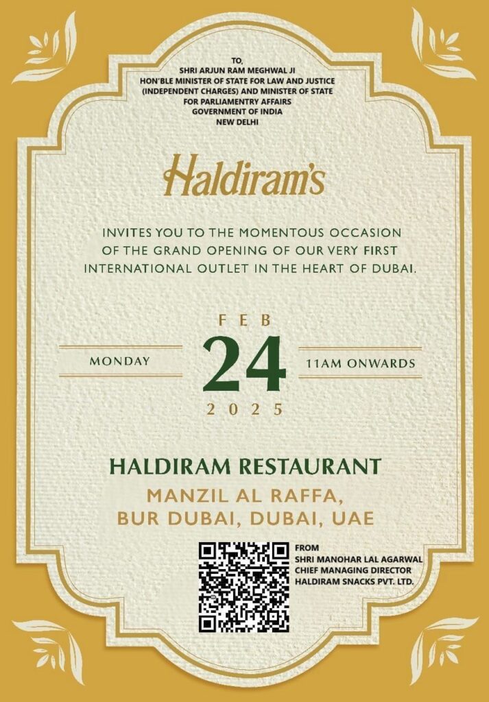 बीकानेर केंद्रीय कानून मंत्री अर्जुनराम मेघवाल ने आज दुबई में हल्दीराम के रेस्टोरेंट का दुबई में उद्घाटन किया दुबई में खुलने वाला ये आउटलेट हल्दीराम का पहला अंतर्राष्ट्रीय आउटलेट है। इस अवसर पर हल्दीराम ग्रुप के शिवकिशन अग्रवाल, शिवरतन अग्रवाल, मनोहर अग्रवाल, मधु अग्रवाल, राजीव वर्मा, तेजाराम मेघवाल, भाजयुमो महामंत्री पंकज अग्रवाल, रमेश अग्रवाल, राजेंद्र गिदवानी, रवि अग्रवाल, विनोद भोजक के साथ हल्दीराम और बीकाजी परिवार उपस्थित रहा।