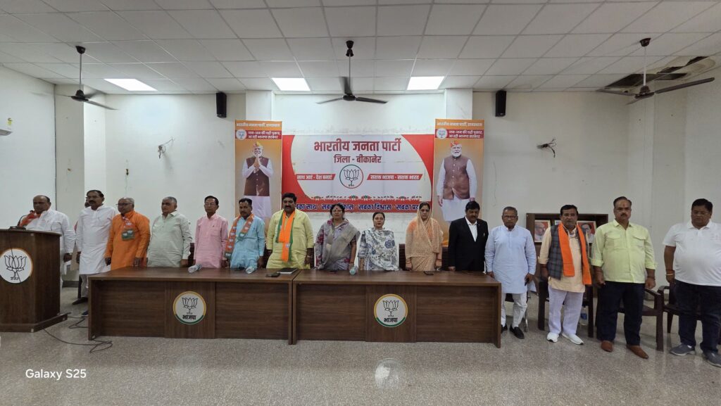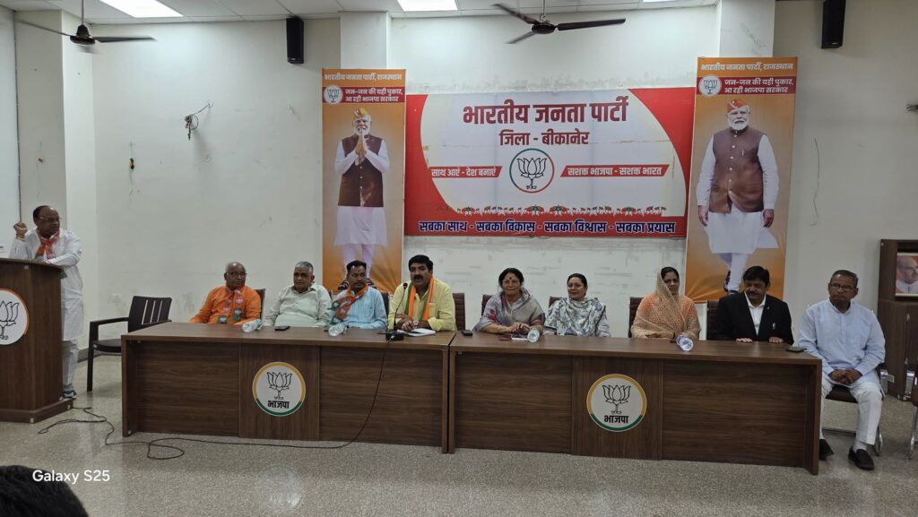 बीकानेर भारतीय जनता पार्टी शहर जिलाध्यक्ष सुमन छाजेड़ देहात जिलाध्यक्ष श्याम पंचारिया की अध्यक्षता में बीकानेर संभाग कार्यालय में आज मुख्यमंत्री भजनलाल शर्मा के आगमन से पूर्व तैयारी बैठक रखी गई जिसमें भाजपा प्रदेश मंत्री वासु चावला मुख्य वक्ता उपस्थित रहे कल वाले किसान सम्मेलन को किस तरह सफल बनाया जाए इसको लेकर जिला पदाधिकारियों, मंडल, मोर्चा अध्यक्षों से चर्चा की गई प्रदेश मंत्री वासु चावला ने इस किसान सम्मेलन को सफल बनाने के लिए बीकानेर शहर और देहात से हजारों कार्यकर्ता इस किसान सम्मेलन में शामिल होंगे पहली बार राजस्थान दिवस को संभाग स्तर पर पूरे सप्ताह मनाया जा रहा है और कल बीकानेर संभाग में मुख्यमंत्री भजनलाल शर्मा किसान सम्मेलन को संबोधित करेंगे चावला ने बताया कल सुबह 10:30 बजे मुख्यमंत्री केशवानंद विश्वविद्यालय पहुंचेंगे वहां किसान सम्मेलन को संबोधित करेंगे कृषि मंत्री किरोड़ी लाल मीणा, चिकित्सा मंत्री गजेंद्र सिंह खींवसर , खाद्य एवं नागरिक आपूर्ति सुमित गोदारा भी उपस्थित रहेंगे। शहर जिलाध्यक्ष सुमन छाजेड़ ने कहा बीकानेर शहर में मुख्यमंत्री भजनलाल जी का पहला सार्वजनिक कार्यक्रम है मुख्यमंत्री की एक झलक पाने को लोग उत्साहित है बीकानेर की जनता पलक पांवड़े बिछाकर उनके स्वागत को आतुर है। देहात जिलाध्यक्ष श्याम सुंदर चौधरी ने कहा मुख्यमंत्री भजनलाल शर्मा को सुनने केलिए बीकानेर देहात की प्रत्येक विधानसभा से हजारों किसान इस किसान सम्मेलन में शामिल होंगे। आज की बैठक में विधायक सिद्धि कुमारी, विश्वनाथ मेघवाल, ताराचंद सारस्वत, ओबीसी मोर्चा प्रदेशाध्यक्ष चंपालाल गैदर, प्रदेश कार्यकारणी सदस्य सत्यप्रकाश आचार्य, मुमताज अली भाटी, प्रभारी ओम सारस्वत, डूंगरगढ़ नगर पालिका चेयरमैन मानमल शर्मा, पूर्व जिलाध्यक्ष विजय आचार्य, जालम सिंह भाटी, पूर्व महापौर सुशीला कंवर राजपुरोहित, राजेंद्र पंवार, महावीर रांका, महामंत्री मोहन सुराणा, श्याम सुंदर चौधरी, नरेश नायक, महेश मुंड, सवाई सिंह तंवर, उपाध्यक्ष हनुमान सिंह चावड़ा, आनंद सिंह भाटी, बाबूलाल गहलोत, जितेंद्र राजवी, विजय उपाध्याय, गोकुल जोशी, दीपक पारीक, शिव प्रजापत, जिला मंत्री मनीष सोनी, संगीलाल गहलोत, कौशल शर्मा, इंद्रा व्यास, भारती अरोड़ा, अनु सुथार, मोर्चा अध्यक्ष भंवरलाल जांगिड़, राजाराम सीगड़, सोहन चांवरिया, चंद्र मोहन जोशी, जसराज सिंवर, वेद व्यास, मंडल अध्यक्ष प्रकाश मेघवाल, प्रेम गहलोत, आशा आचार्य, विशाल गोलछा, दिनेश चौहान, कपिल शर्मा, देवरूप शेखावत, मुकेश सैनी, धर्मपाल डूडी, सावन पुरोहित, प्रकाश नाथ, राकेश नायक, तोलाराम कूकना, सुरेन्द्र चुरा, महेंद्र सिंह, नरेश मोठ, राजू गोदारा, मांगू सिंह, करना राम, डूंगर स