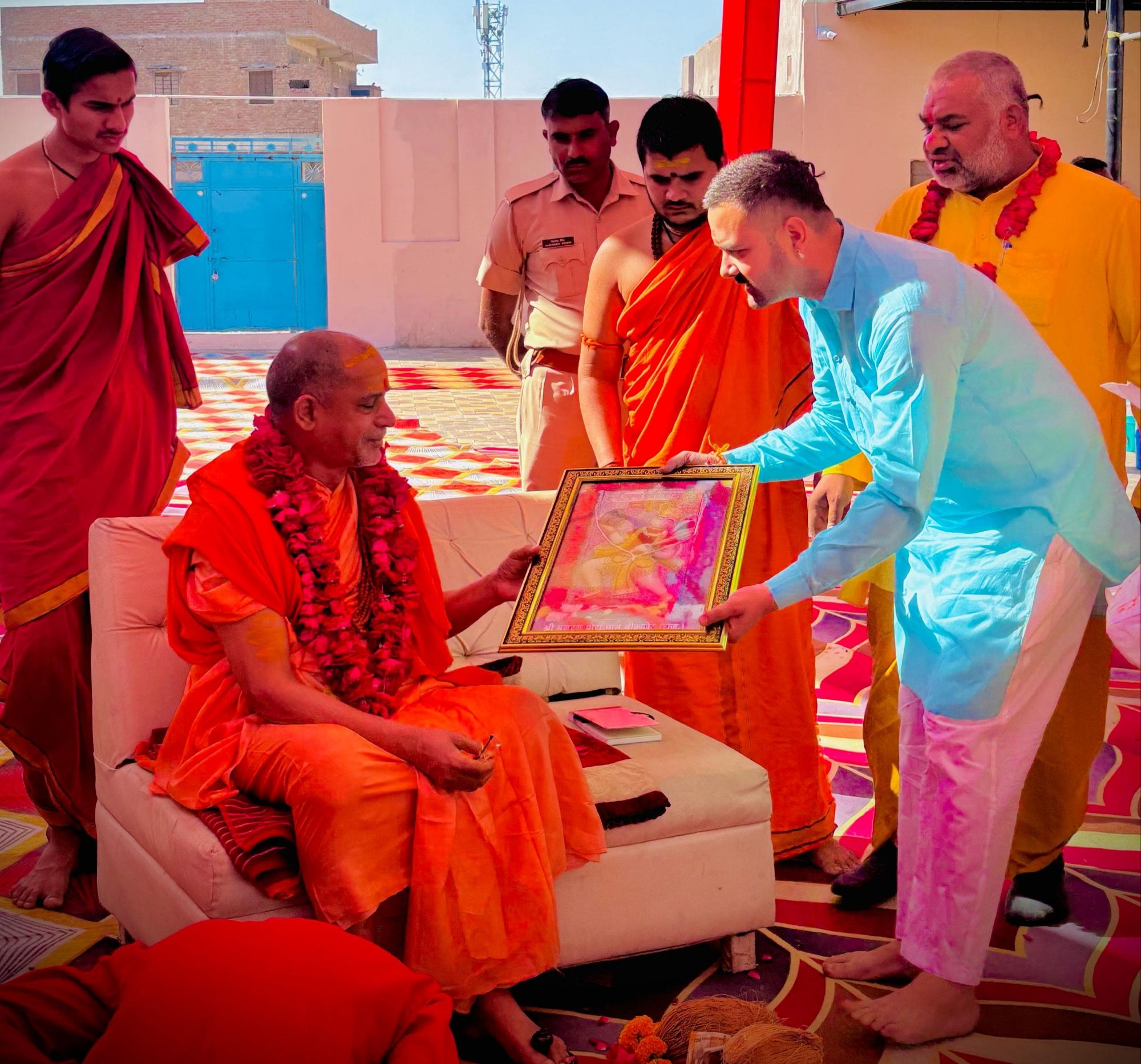 राजस्थान की पावन धरा छोटा काशी नाम से विख्यात बीकानेर में जगद्गुरु शंकराचार्य द्वारका शारदा पीठाधीश्वर स्वामी श्री सदानंद जी महाराज को गोबर का आसान और गौमय माला भेंट करते हुए गौ धन मित्र के महेंद्र जोशी ।