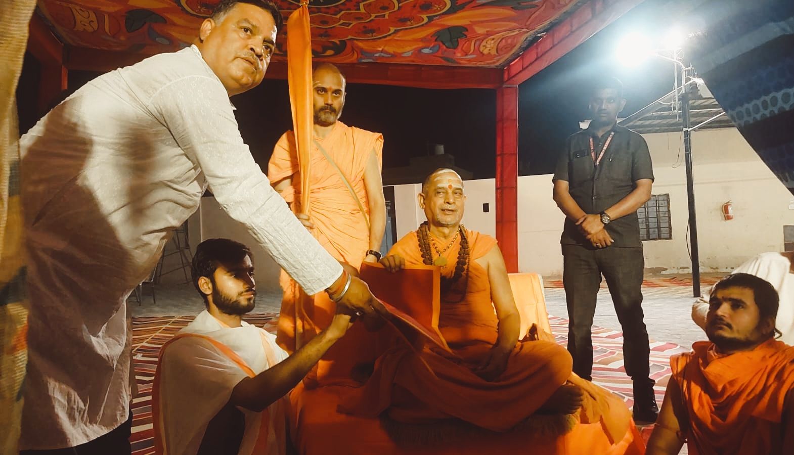 बीकानेर । राजस्थान की पावन धरा छोटा काशी नाम से विख्यात बीकानेर में जगद्गुरु शंकराचार्य द्वारका शारदा पीठाधीश्वर स्वामी श्री सदानंद जी महाराज को गोबर का आसान और गौमय माला भेंट करते हुए गौ धन मित्र के महेंद्र जोशी ।