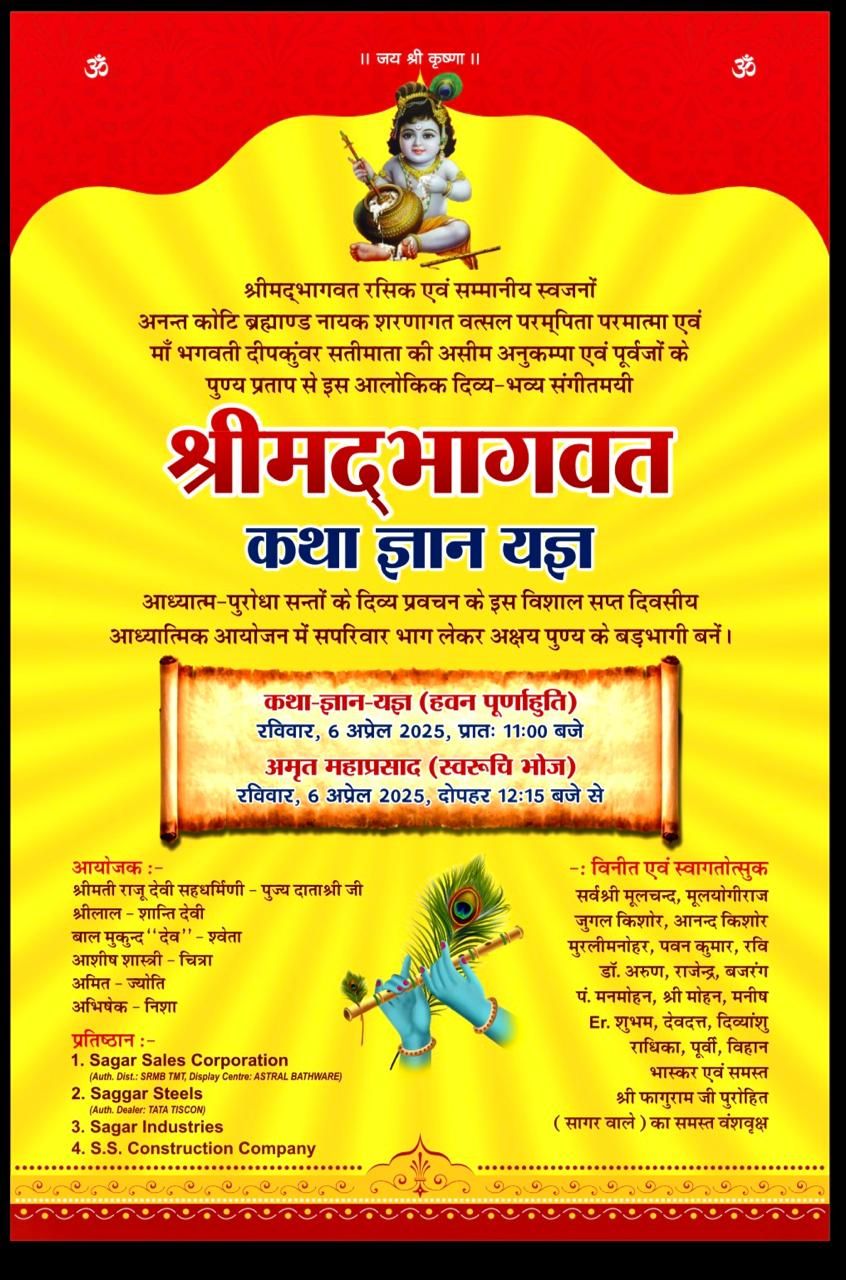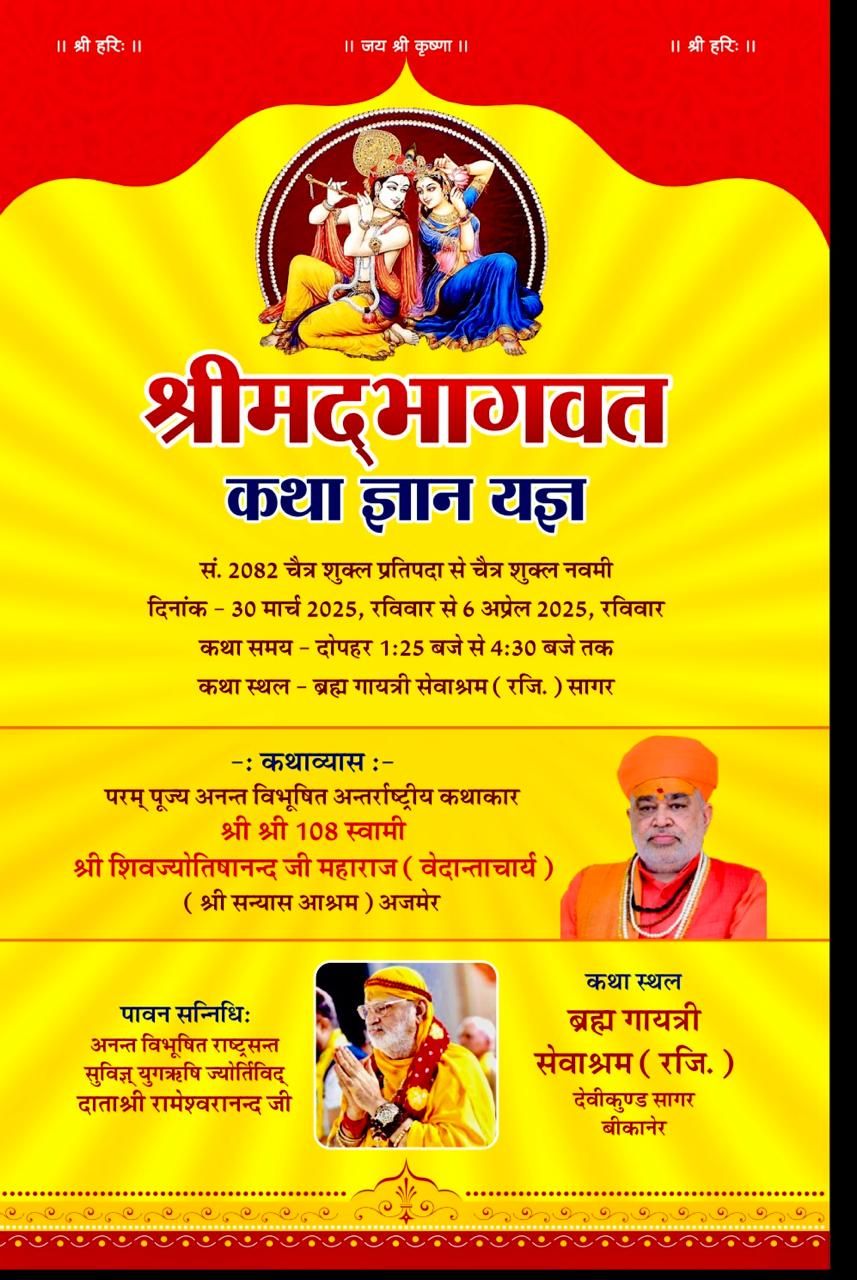 के पावन सानिध्य में *ब्रह्म गायत्री सेवाश्रम सागर* की सिद्ध धरा पर सप्त दिवसीय श्रीमद्भागवत कथा ज्ञान यज्ञ का आयोजन होगा,आपसे निवेदन की आप अपने परिकर सहित पधार कर कथा श्रवण कर इस पावन अवसर का लाभ प्राप्त कर अपने को अक्षय व अनंत पुण्य के बड़भागी बनावें।