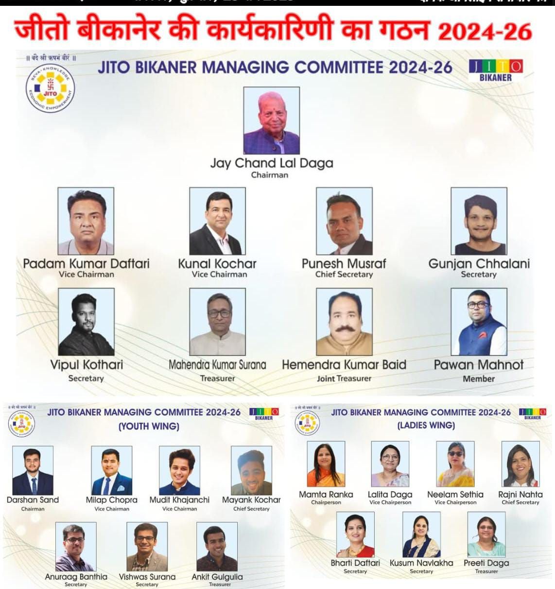जीतो महासचिव पुनेश मुसरफ ने बताया कि संगठन की महिला विंग में श्रीमती ममता रांका-अध्यक्ष, ललिता डागा व नीलम सेठिया उपाध्यक्ष, रजनी नाहटा महासचिव, भारती दफतरी व कुसुम नवलखा सचिव, प्रीति डागा कोषाध्यक्ष के रूप् में पद के दायित्व की शपथ ली। जीतों यूथ विंग में दर्शन सांड अध्यक्ष, मिलाप चोपड़ा व मुदित खजांची उपाध्यक्ष, मयंक कोचर महासचिव, अनुराग बांठिया व विश्वास सुराणा सचिव व अंकित गुलगुलिया कोषाध्यक्ष के रूप् में शपथ ली।