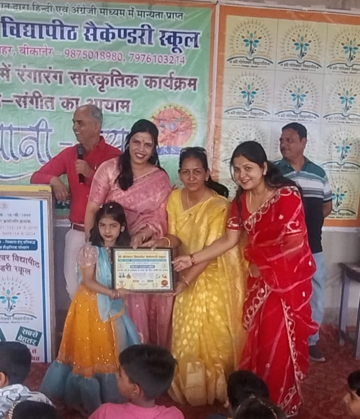 बीकानेर। उपनगरीय क्षेत्र गंगाशहर की प्रतिष्ठित स्कूल श्री गोपेश्वर विद्यापीठ द्वारा शनिवार को आयोजित किए गए “राजस्थानी – रास” कार्यक्रम में स्टूडेंट्स, टीचर्स एवं पेरेंट्स के साथ साथ अतिथियों ने भी जमकर एंज्वॉय किया। विद्यापीठ के समन्वयक गरिराज खैरीवाल ने बताया कि गणगौर पर्व के उपलक्ष्य में आयोजित किए गए इस अभिनव आयोजन में राजस्थान के स्थापना दिवस, भारतीय नव – वर्ष, चैत्र नवरात्रि, चेटीचंड, ईद-उल-फितर एवं नए वित्तीय वर्ष का सेलीब्रेशन भी किया गया। उन्होंने बताया कि पूरे 3 घंटे तक चले इस अभिनव कार्यक्रम में रंगारंग सांस्कृतिक प्रस्तुतियों के दौर अनवरत चलते रहे। गणगौर एवं राजस्थानी लोक नृत्यों की मनभावन प्रस्तुतियों को देखकर कार्यक्रम के अतिथि राजकीय उच्च माध्यमिक विद्यालय, रूणिया बड़ा बास की प्रधानाचार्या श्रीमती चंद्रकला चौधरी, समता समग्र आरोग्यम संस्थान की प्रभारी चिकित्साधिकारी डॉ. नेहा जैन, आर्ट ऑफ लिविंग की प्रशिक्षिका दमयन्ती सुथार एवं राजस्थान प्राकृतिक चिकित्सा संस्थान की प्रभारी चिकित्साधिकारी डॉ. वत्सला गुप्ता भी थिरकने से नहीं रूक सके। सभी अतिथियों नेे भी हमारी सांस्कृतिक विरासत की पहचान राजस्थानी लोकगीतों पर जमकर नृत्य किए। सभी अतिथियों ने कार्यक्रम को अत्यंत ही डिसेंट और एंज्वॉयफुल बताते हुए कहा कि हमारी सांस्कृतिक विरासत को ऐसे आयोजनों से ही सहेजा जा सकेगा। शाला – प्रधान भंवरी देवी ने बताया कि इस अवसर पर सात श्रेणियों में बेस्ट पार्टिशिपेट, बेस्ट स्माइल, बेस्ट डांस, एवं बेस्ट कॉस्ट्यूम के पुरस्कार दिए गए। पेरेंट्स कैटेगरी में दिव्या राजपुरोहित, निकी अग्रवाल, भगवती पारख, ज्योति सुथार एवं रेखा बाणिया ने अवार्ड हासिल किए। मिक्स कैटेगिरी में प्रियंका उपाध्याय, खुशी शर्मा एवं कनिष्का सोनी को सम्मानित किया गया। प्री प्राइमरी कैटेगरी में नव्या सेवग, छत्रपति शर्मा, देवांशी कंसारा एवं शांति भादाणी, प्राईमरी कैटेगरी में प्रियांशी अग्रवाल, नेहा देरासरी, आशा सुथार एवं वैष्णवी पुरोहित, भाविका प्रजापत, पीहू अग्रवाल, परी जीनगर, मिसिता जीनगर, एवं नम्रता सोनगरा, अपर प्राईमरी कैटेगरी में भव्या सुथार, गुंजन राजपुरोहित, पूनम सुथार, भावना सुथार, कविता प्रजापत एवं सीया जीनगर तथा सैकेंडरी कैटेगरी में नंदिनी बाणिया, कीर्ति टाक एवं गंगा को सम्मानित किया गया। समन्वयक गिरिराज खैरीवाल ने सभी अतिथियों का स्वागत करते हुए उनके परिचय प्रस्तुत किए तथा आयोजन के महत्व पर प्रकाश डाला। सभी अतिथियों को तिरंगी पताका एवं स्मृति चिन्ह भेंट कर विद्यालय की प्रधानाध्यापिका भंवरी देवी ने स्वागत-अभिनंदन किया। अश्लेषा खैरीवाल ने सभी अतिथियों का स्वागत तिलक लगाकर क