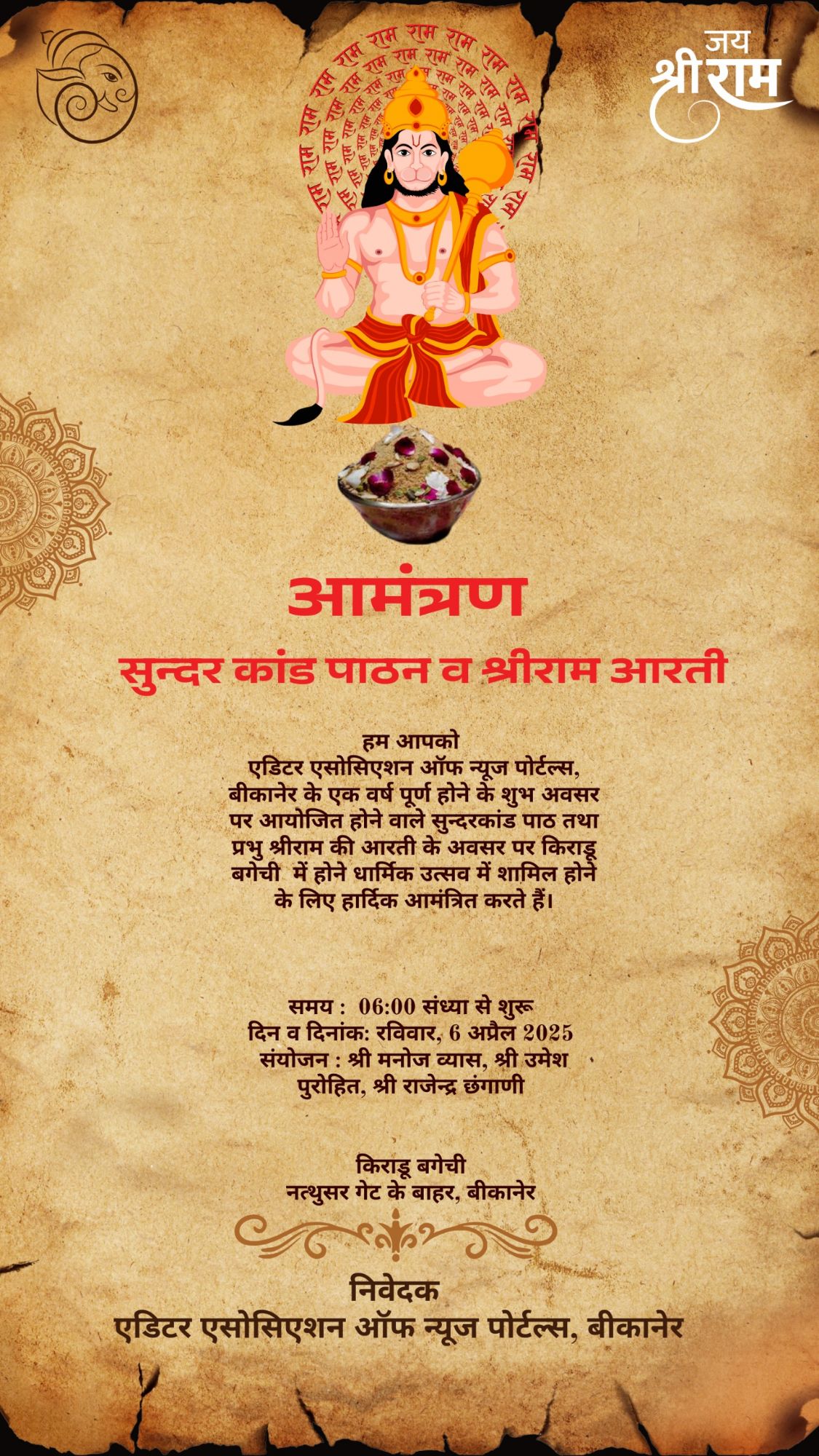 कार्यक्रमों की शुरुआत 6 अप्रैल को रविवार शाम 6 से 8 बजे के बीच स्थानीय भलचंद्र गणेश मंदिर परिसर में सुंदरकांड पाठ के आयोजन के साथ होगी, जिसका नेतृत्व संगठन के कोषाध्यक्ष मनोज व्यास और वरिष्ठ सदस्य राजू छांगाणी करेंगे। यह धार्मिक आयोजन संगठन के सफल एक वर्ष की यात्रा के प्रति आभार प्रकट करने और शुभकामनाओं के आदान-प्रदान के उद्देश्य से किया जा रहा है।