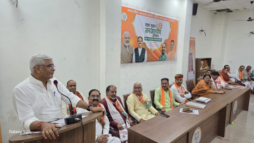 बीकानेर आज भारतीय जनता पार्टी संभाग कार्यालय में कार्यालय में वक्फ संशोधन कानून पर आयोजित वक्फ सुधार जनजागरण अभियान कार्यशाला शहर जिलाध्यक्ष सुमन छाजेड़ देहात जिलाध्यक्ष श्यामसुंदर पंचारिया की अध्यक्षता में सम्पन्न हुई इस कार्यशाला में मुख्य वक्ता केंद्रीय संस्कृति व पर्यटन मंत्री गजेंद्र सिंह शेखावत, अल्पसंख्यक मोर्चा प्रदेशाध्यक्ष हमीद खां मेवाती उपस्थित रहे।