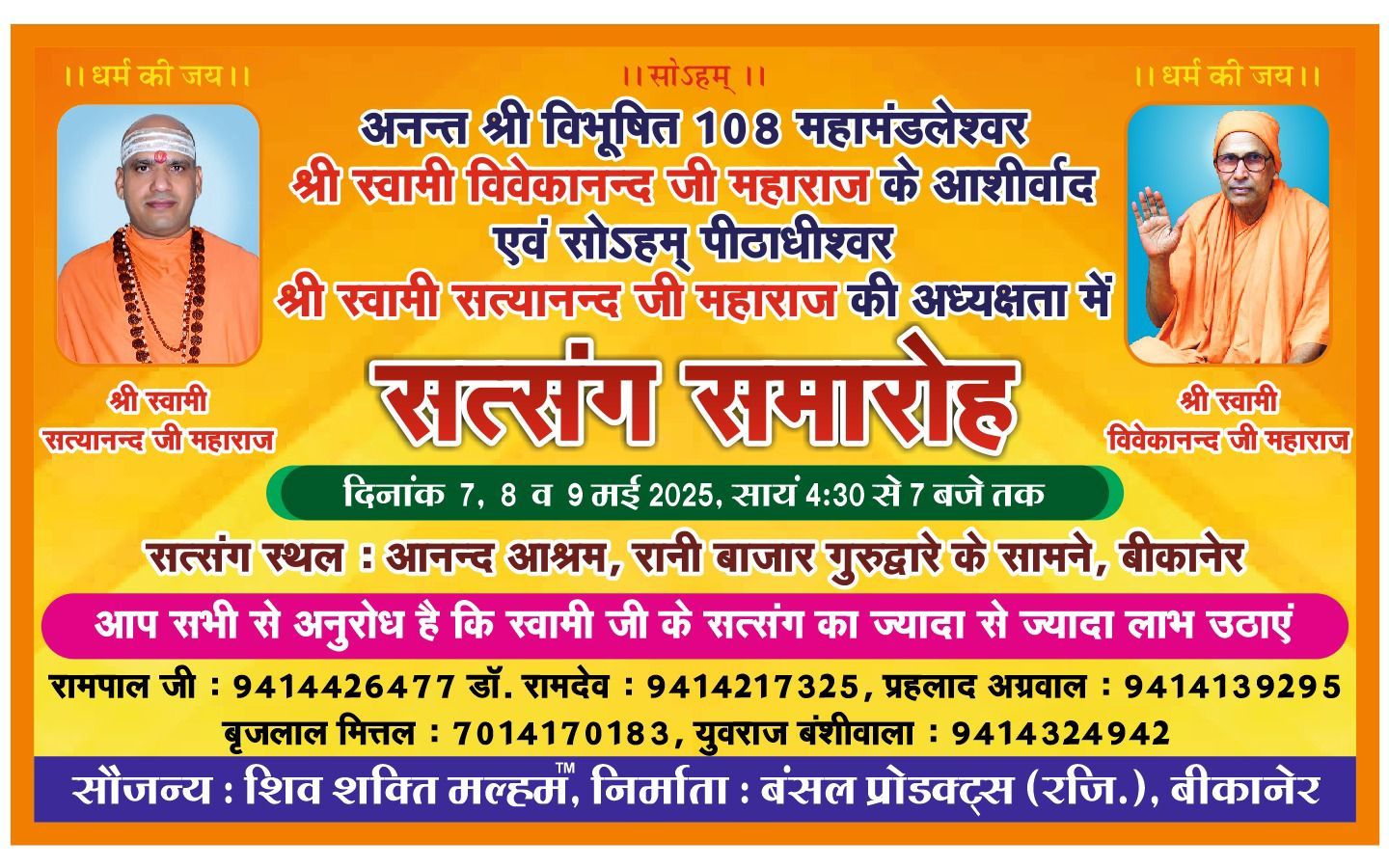 बीकानेर । अनंत श्री विभूषित 108 महामंडलेश्वर श्री स्वामी विवेकानंद महाराज के आशीर्वाद से सोहम पीठाधीश्वर श्री स्वामी सत्यानंद जी महाराज की अध्यक्षता नवल राम जी महाराज के सानिध्य में सत्संग समारोह 7 मई से आयोजित किया जाएगा । यह आयोजन रानी बाज़ार स्थित आनंद आश्रम में किया जाएगा । आयोजन से जुड़े राधेश्याम अग्रवाल डॉक्टर रामदेव अग्रवाल बृजलाल मित्तल प्रहलाद अग्रवाल रामदेव जी अग्रवाल रंगवाले मधुसूदन मनीष खत्री युवराज बंसी वाला ने बताया कि यह कार्यक्रम शाम 4.30 बजे से 7 बजे तक प्रतिदिन होंगे