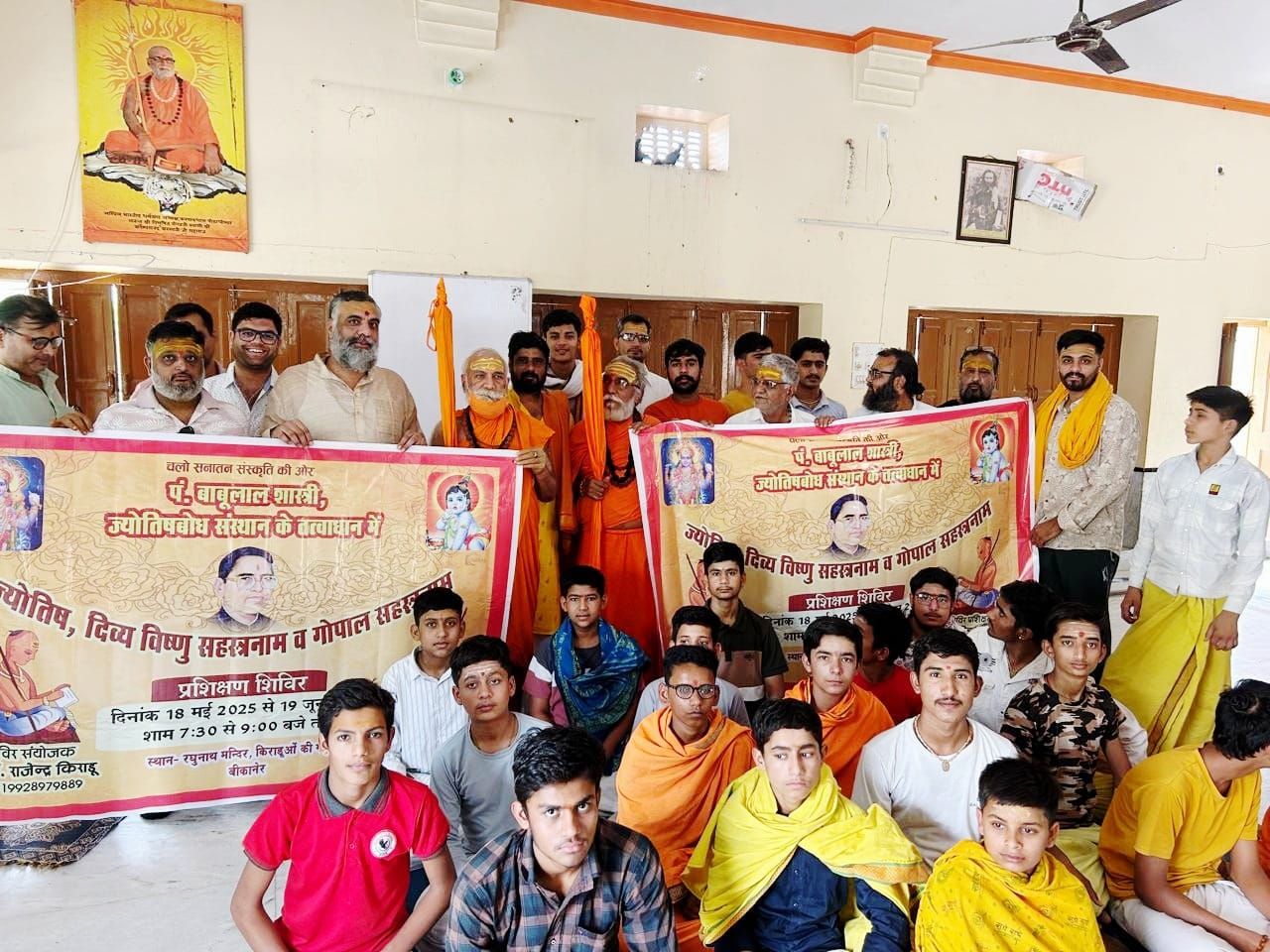 पंडित बाबूलाल शास्त्री ज्योतिष बोध संस्थान के तत्वाधान में रधुनाथसर कुंआ स्थित रघुनाथ जी मंदिर परिसर में 18 मई से 19 जून तक ज्योतिष ,दिव्य विष्णु सहस्रनाम एवम गोपाल सहस्त्रनाम का निःशुल्क प्रशिक्षण शिविर लगाया जा रहा है।शिविर का समय शाम 7:30 से रात्रि 09 बजे का है , शिविर सयोंजक ज्योतिषाचार्य पण्डित राजेन्द्र किराड़ू ने बताया कि ज्योतिष के लिए ज्योतिषाचार्य पण्डित विमल किराड़ू और दिव्य विष्णु सहस्रनाम और गोपाल सहस्त्रनाम के लिए पण्डित प्रह्लाद व्यास प्रशिक्षण देंगे ।किराड़ू ने बताया कि संस्थान का उद्देश्य आज की युवा पीढ़ी को सनातन धर्म की और ले जाने लिए उत्प्रेरक का कार्य करना है। इसी सिलसिले में आज शिविर के पोस्टर का लोकार्पण श्री करपात्री महाराज संस्कृत वेद विद्यालय के अधिष्ठाता श्रीधरानन्द सरस्वती महाराज एवम करपात्री धाम काशी के अधिष्ठाता सर्वेशरानन्द महाराज ने किया।इस अवसर पर पण्डित मुरलीधर पुरोहित , पण्डित विमल किराड़ू , पं. दामोदर किराड़ू , पं. श्याम व्यास , हिमांशु किराड़ू , आदि उपस्थित रहे।