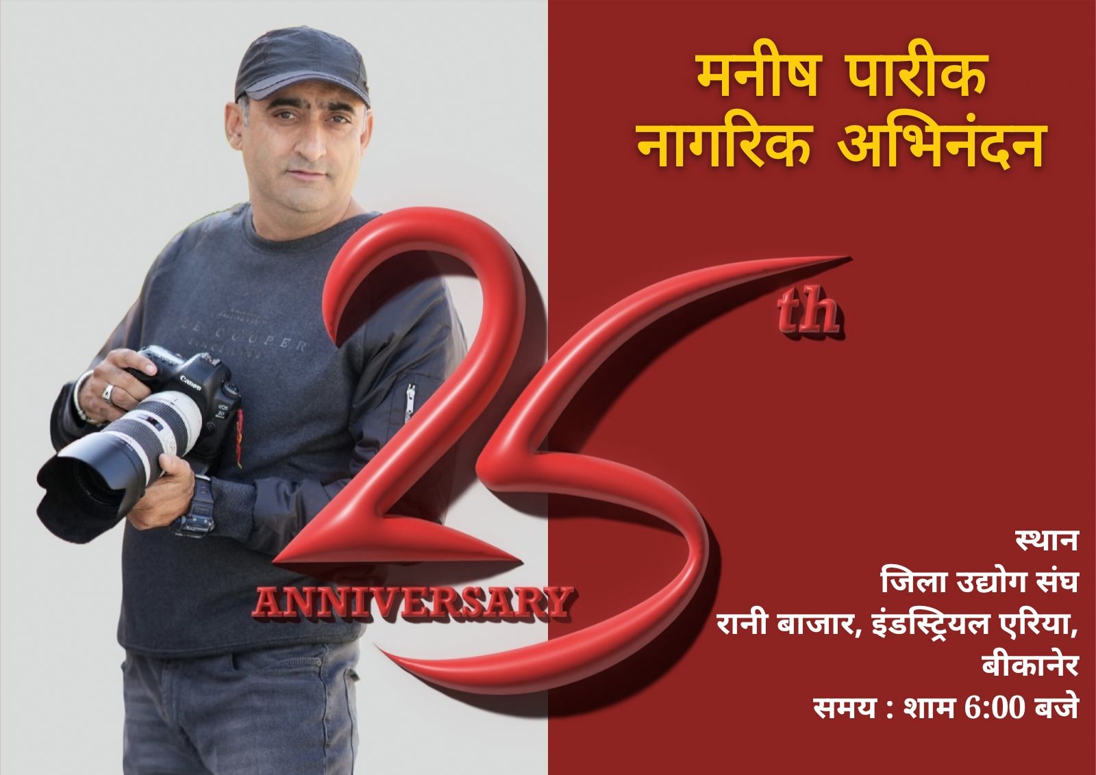 इसीलिए बीकानेर के आम नागरिक मनीष पारीक के 25 वर्ष दैनिक भास्कर में पूर्ण होने पर एक छोटा सा सेलिब्रेशन कार्यक्रम कर रही है। उन सभी बीकानेर निवासियों को निमंत्रण है जो मनीष पारीक की न्यूज़ सेवा को पसंद करते हैं। विशेष रूप से वे लोग भी पधारे जिनको मनीष पारीक ने प्रत्यक्ष अप्रत्यक्ष रूप से निस्वार्थ भाव से मदद की हो। मनीष पारीक हमारे लिए हमेशा तत्पर रहते हैं उनके सम्मान के लिए हम सब के लिए ये विशेष मौका है।