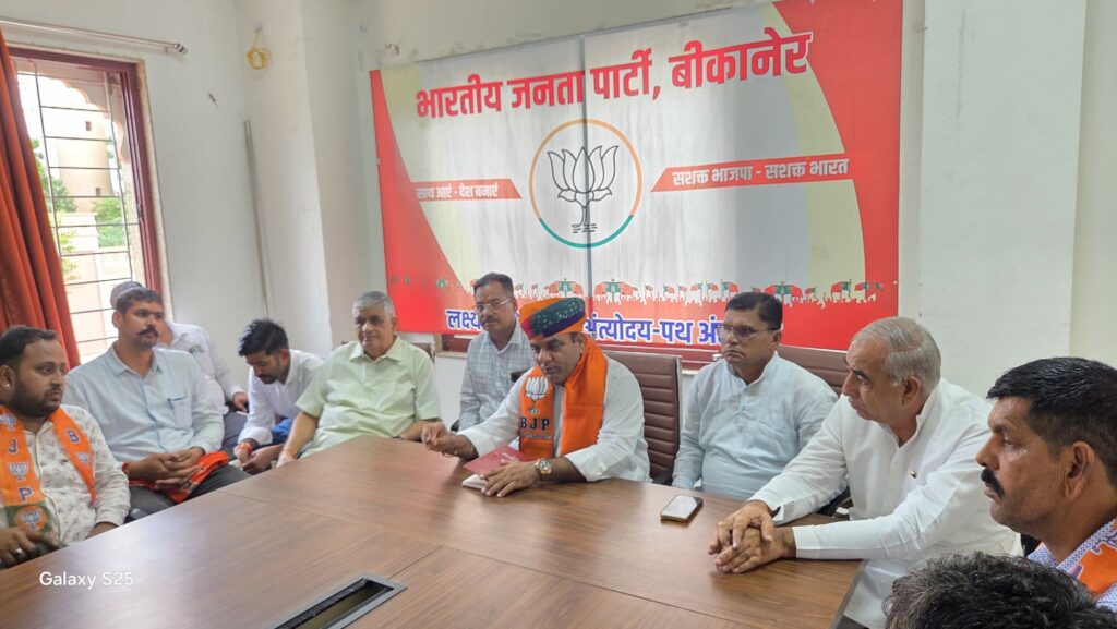 भारतीय जनता पार्टी जिला कार्यालय में आज भाजपा देहात जिलाध्यक्ष श्याम पंचारिया की अध्यक्षता में मुख्यमंत्री भजनलाल शर्मा के 14 अगस्त बीकानेर आगमन से पूर्व तैयारी बैठक रखी गई आज की बैठक में मुख्य वक्ता भाजपा प्रदेश मंत्री विजेंद्र पूनिया के साथ विश्वकर्मा कौशल विकास बोर्ड के अध्यक्ष रामगोपाल सुथार, विधायक विश्वनाथ मेघवाल, जेठानंद व्यास, पूर्व जिलाध्यक्ष जालम सिंह भाटी ने मुख्यमंत्री भजनलाल शर्मा की उपस्थित में भाजपा देहात की तिरंगा यात्रा को लेकर जिला पदाधिकारियों, मंडल अध्यक्षों, मोर्चा अध्यक्षों, छात्र नेताओं को संबोधित किया।