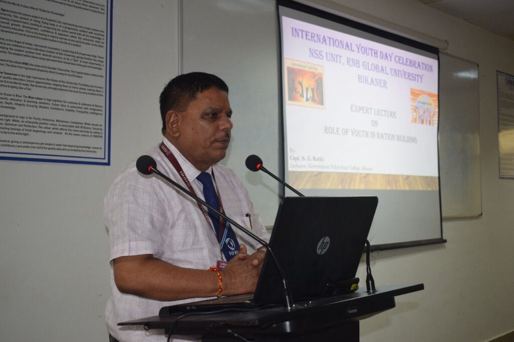 बीकानेर आरएनबी ग्लोबल यूनिवर्सिटी, बीकानेर की एनएसएस इकाई द्वारा अंतरराष्ट्रीय युवा दिवस के अवसर पर “राष्ट्र निर्माण मे ं युवाओं की भूमिका” विषय पर एक विशेषज्ञ ख्यान का आयोजन किया गया। कार्यक्रम का शुभारंभ एनएसएस सहायक कार्यक्रम अधिकारी डॉ. त्रिभुवन सिंह राजपुरोहित एवं छात्रा समन्वयक सुश्री लक्षिता पंवार द्वारा मुख्य अतिथि, संकाय सदस्यों और छात्र-छात्राओं के स्वागत से हुआ। एनएसएस संयोजक एवं डीन एकेडेमिक्स प्रोफेसर बजरंग सिंह राठौड ़ ने कार्यक्रम के उद्देश्यों का संक्षिप्त परिचय दिया।