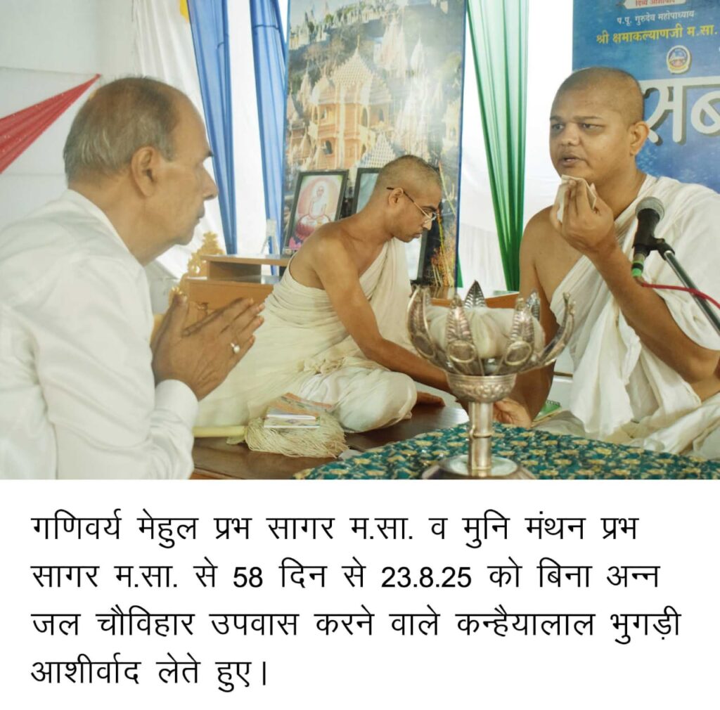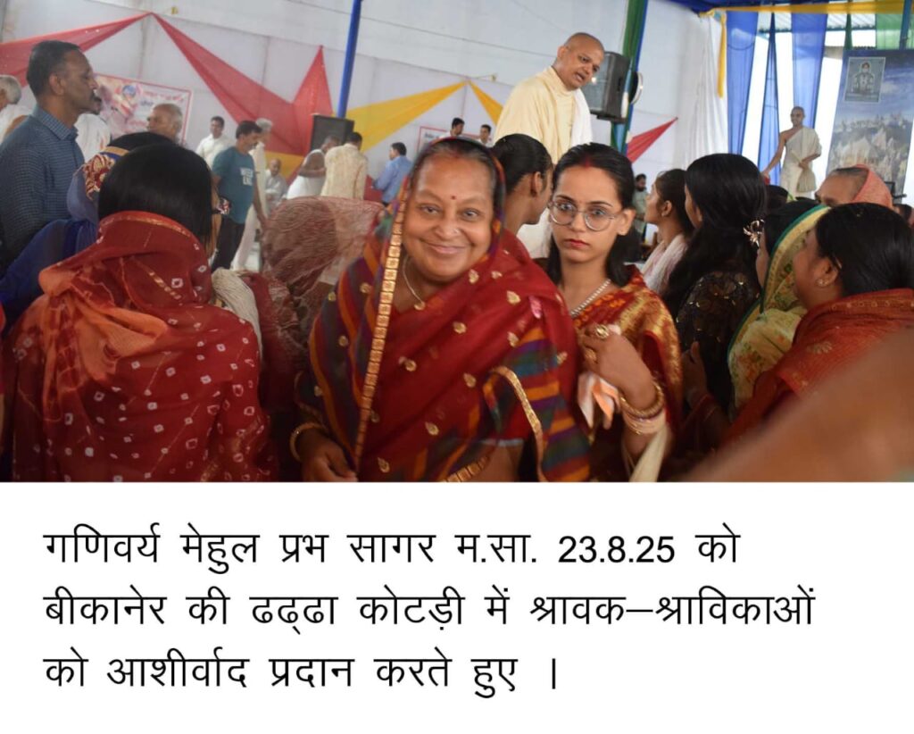 बीकानेर, 23 अगस्त। गणिवर्य श्री मेहुल प्रभ सागर म.सा., मंथन प्रभ सागर, बाल मुनि मीत प्रभ सागर, साध्वीश्री दीपमाला, शंखनिधि के सान्निध्य में शुक्रवार को पर्युषण पर्व के तहत ’’कल्पसूत्र’ के प्रसंगानुसर परमात्मा महावीर के पालनाजी व मुनीम के पद का निर्धारण किया गया। चौविहार (बिना अन्न जल ) के 58 दिन की तपस्या पूर्ण करने वाले कन्हैयालाल भुगड़ी तथा अक्षय निधि व अन्य तपस्याएं करने वाले तप के तपस्वियों की अनुमोदना की गई।