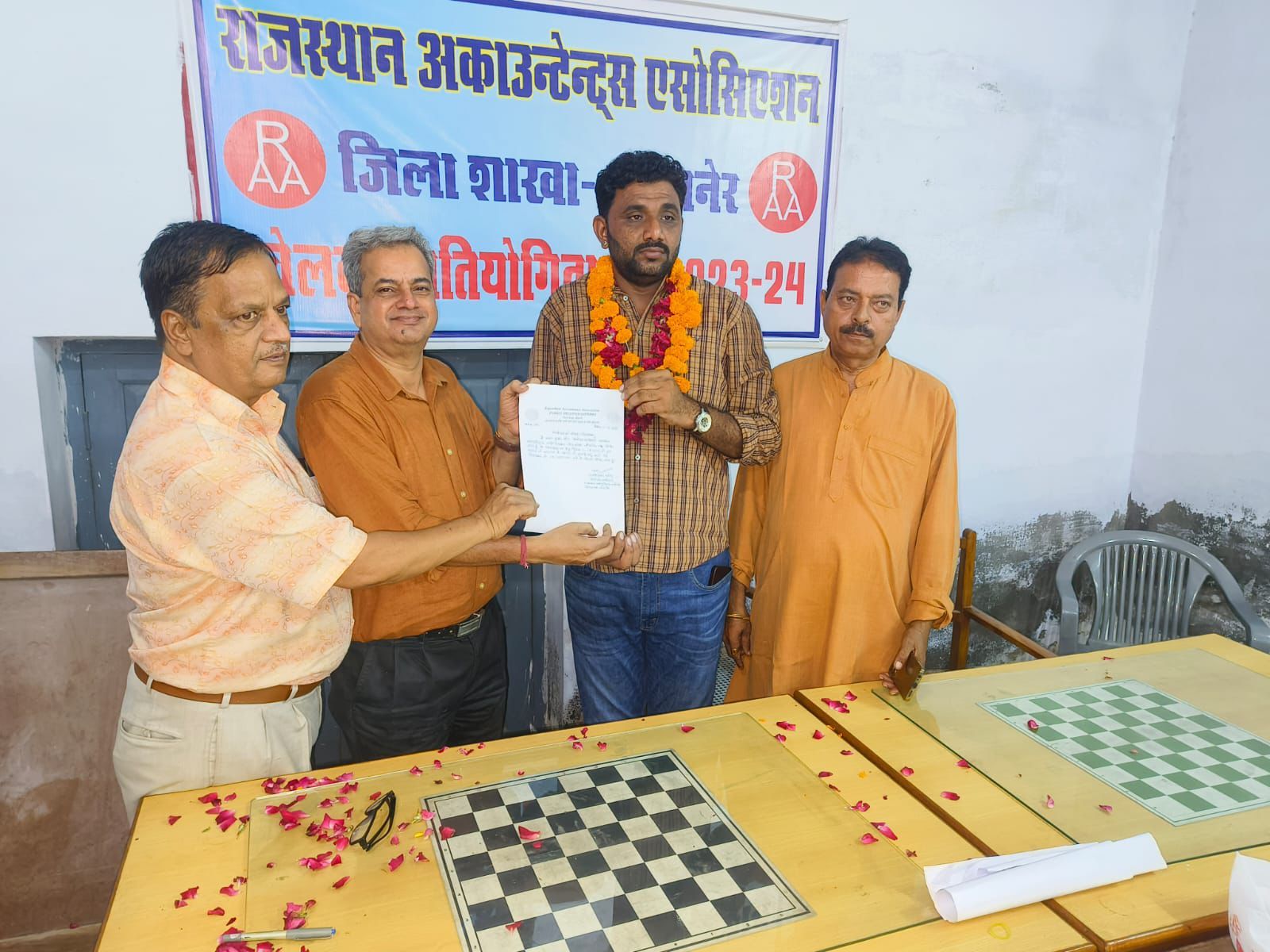 राजस्थान एकाउन्टेन्ट्स एसोसिएशन जिला शाखा बीकानेर के जिलाध्यक्ष एवं प्रान्तीय प्रतिनिधियों के चुनाव वर्ष 2025 हेतु चुनाव अधिकारी श्रवण छींपा ने बताया कि इस बार जिलाध्यक्ष के साथ-साथ 11 प्रान्तीय प्रतिनिधियों के चुनाव दिनांक 01.09.2025 को सम्पन्न हुऐ जिसमें जिलाध्यक्ष पद हेतु प्रत्यासी श्री सवाई सिंह भाटी निकटतम प्रतिद्वंद्वी श्री जितेन्द्र चौधरी से 58 मतों से विजयी घोषित किये गयें।