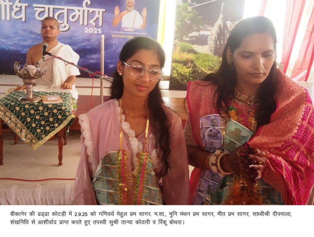 गणिवर्य मेहुल प्रभ सागर, मंथन प्रभ सागर, मीत प्रभ सागर, साध्वीश्री दीपमाला व शंख निधि के सान्निध्य में आठ की तपस्या करने वाली तान्या पुत्री श्रीपाल-अनिता कोठारी तथा रिंकू बोथरा पत्नी कुश बोथरा का अभिनंदन मंजू धारिवाल, शर्मिला खजांची, खरतरगच्छ महिला परिषद की बीकानेर इकाई अध्यक्ष मनीषा खजांची, भावना बैद डागा ने किया। उधर आठ दिन की तपस्या करने वाले रूपम राखेचा का वरघोड़ा ’’खासोजी’के साथ निकला । तपस्वियों ने भगवान आदिनाथ, चिंतामणि व वैदों के व आसानियों के चौक के महावीरजी के मंदिर में दर्शन किए। तपस्वियों के वरघोड़े में शामिल श्रावक-श्राविकाएं जैन धर्म व तपस्वियों का जयकारा लगा रहे थे। रूपम राखेचा का जैन श्वेताम्बर मूर्ति पूजक पार्श्वचन्द्र गच्छ संघ की ओर से अभिनंदन किया गया।