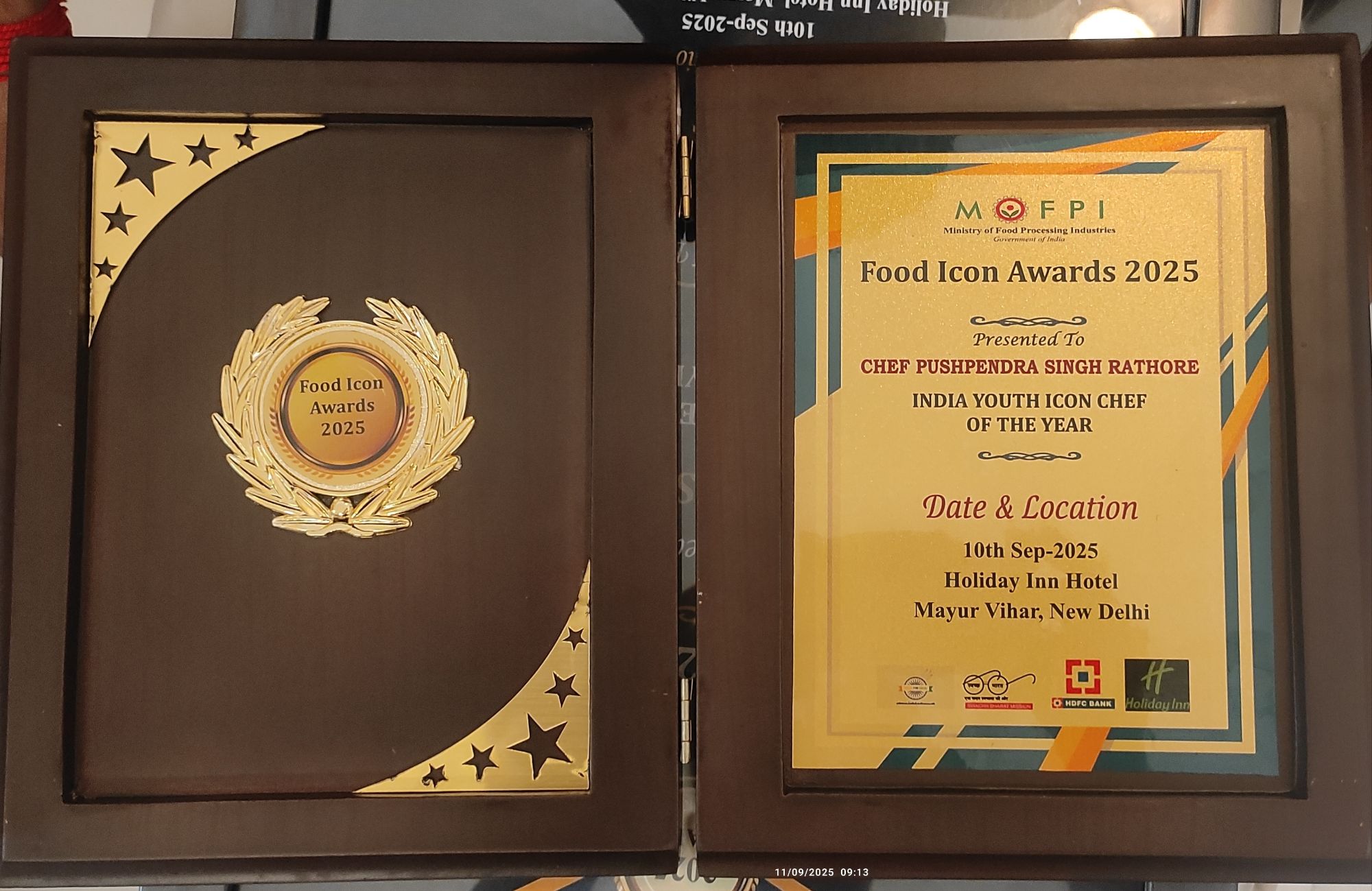 नई दिल्ली मिनिस्ट्री ऑफ़ फ़ूड प्रोसेसिंग इंडस्टरीज गवर्नमेंट ऑफ़ इंडिया के द्वारा फूड आइकन अवार्ड 2025 एक भव्य कार्यक्रम में फूड प्रोसेसिंग इंडस्टरीज से जुड़े लोगों को वितरित किए गए! मेरिट अवार्ड और मार्केट रिसर्च द्वारा आयोजित फूड आइकन अवार्ड 10 सितंबर 2025 होलीडे इन होटल मयूर विहार दिल्ली में आयोजित किया गया कार्यक्रम में नामी शेफ कुणाल कपूर शेफ परविंदर सिंह बाली कार्यक्रम में उपस्थित रहे! ,