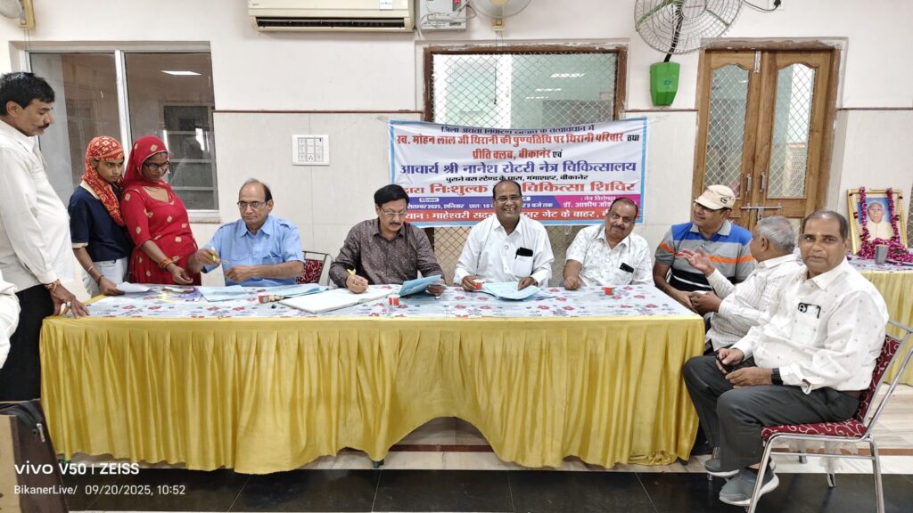 बीकानेर, 20 सितम्बर। जिला अंधता निवारण समिति के तत्वावधान में समाज सेवी मोहन लाल थिरानी की पुण्य तिथि पर प्रीति क्लब, बीकानेर एवं आचार्यश्री नानेश रोटरी नेत्र चिकित्सालय,गंगाशहर व थिरानी परिवार, की ओर से जस्सूसर गेट के बाहर कोठारी अस्पताल मार्ग स्थित माहेश्वरी सदन में शनिवार को निःशुल्क नेत्र चिकित्सा शिविर आयोजित किया गया शिविर में 250 से अधिक रोगियों की आंखों की जांच की गई जिनमें चयनित 15 मरीजों का ऑपरेशन रविवार को होगा।