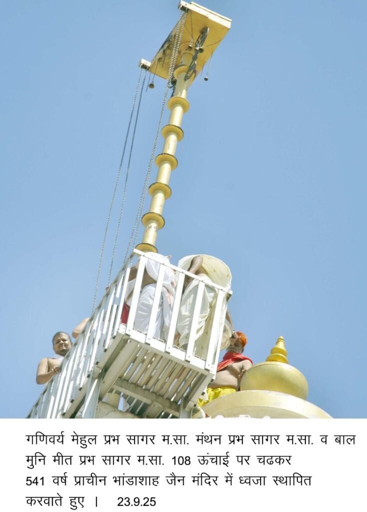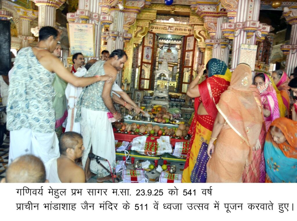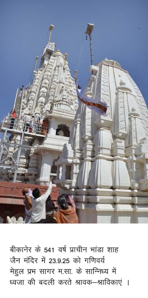 बीकानेर, 23 सितम्बर। श्री चिंतामणि जैन मंदिर प्रन्यास के तत्वावधान में सकल श्रीसंघ के सहयोग से गणिवर्य मेहुल प्रभ सागर, मुनि मंथन प्रभ सागर, बाल मुनि मीत प्रभ सागर के सान्निध्य में मंगलवार को 15 वीं शताब्दी में विक्रम संवत 1541 में बने भांडाशाह जैन मंदिर में 511 वां वार्षिक ध्वजा उत्सव शांति स्नात्र पूजा, भक्ति संगीत के 18 अभिषेक के साथ मनाया गया।