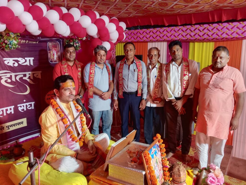 नोखा। नोखा के समीप नोखा गांव में पूनरासर धाम जाने वाले पैदल यात्री जय श्री राम संघ एवं ग्रामीणो द्वारा संघ के 27 वर्ष पूर्ण होने के उपलक्ष में शारदीय नवरात्रा के पावन पर्व पर 22 सितंबर से 30 सितंबर 9 दिन तक दोपहर 12:15 बजे से शाम 4:15 बजे तक श्री राम कथा का भव्य आयोजन किया जा रहा है। नोखा गांव सहित आसपास व दूर दराज के श्रद्धालु बड़ी तादाद में राम कथा का रसपान करते हुए पुण्य लाभ ले रहे हैं। व्यास पीठ पर विराजित भगवान महादेव उपासक कथा व्यास विद्वान पंडित महावीर महाराज ने कथा के तीसरे दिन बुधवार 24 सितंबर को अपनी अमृतमय मधुर वाणी में श्री राम कथा का रसपान कराते हुए श्रोताओं को मंत्रमुग्ध कर दिया। आज तीसरे दिन अयोध्या कांड में भगवान श्री राम के जन्मोत्सव को बड़ी धूमधाम से मनाया गया। महाराज जी ने छोटे से राम को अपनी गोद में लिया और पंडाल में बहुत ही खुशियां मनाते हुए पुष्पवर्षा, थाली बजाकर, शंखनाद से भगवान श्री राम का जन्मोत्सव बड़ी धूमधाम से मनाया गया। इससे पूर्व नोखा से श्रीअर्केश्वर महादेव मंदिर टीम के सदस्य दिनेश सिंह राजपुरोहित, सुरेश कुमार झंवर,मोहित जोशी, इन्द्रचंद मोदी का मंच पर कथा व्यास व आयोजको द्वारा स्वागत किया गया। मुख्य यजमान के रूप में केसरी चन्द पंचारिया ने सपत्नीक व्यास पीठ के सामने प्रथम पक्ति में बैठकर कथा का रसपान किया।