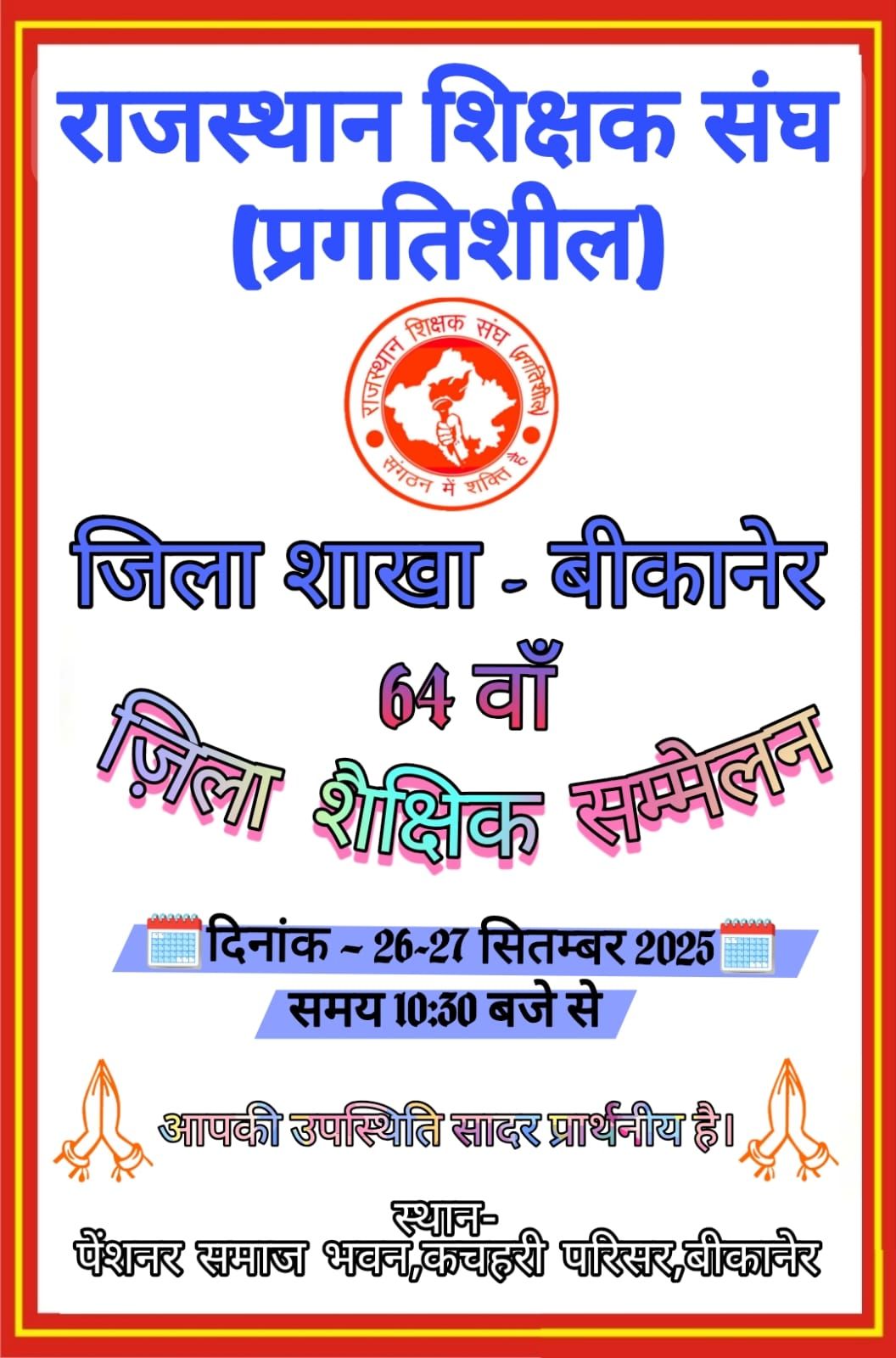 *राजस्थान शिक्षक संघ* *प्रगतिशील का जिला शैक्षिक अधिवेशन दिनांक 26 –27 सितंबर 2025* साथियों संगठन का 64 वा जिला शैक्षिक अधिवेशन पेंशनर समाज भवन ,कचहरी परिसर, बीकानेर में प्रातः 10:30 बजे से आयोजित होगा जिसमें OPS पूर्ण रूप से लागू करने ,8वे वेतनमान आयोग का गठन करने, सभी संवर्गों के स्थानांतरण ( तृतीय श्रेणी सहित)करने, सभी संवर्गों की डीपीसी करने ,बीएड इंटर्नशिप के दौरान पूर्ण वेतन देने ,दो वर्षीय परीक्षा काल में समस्त परिलाभ नियुक्ति तिथि से देने, सेवारत अध्यापक के लिए परीक्षा की अनिवार्यता समाप्त करने ,बोर्ड परीक्षा में 40% की अनिवार्यता आदि समस्या का विचार विमर्श करके प्रस्ताव पारित किए जाकर राज्य सरकार को भिजवाए जाएंगे। *निवेदक आनंद पारीक जिलाध्यक्ष* *असलम मोहम्मद समेजा जिला मंत्री* *यतीश वर्मा प्रदेश महामंत्री* *सुभाष आचार्य प्रदेश सलाहकार मंडल अध्यक्ष* *राजस्थान शिक्षक संघ प्रगतिशील बीकानेर*