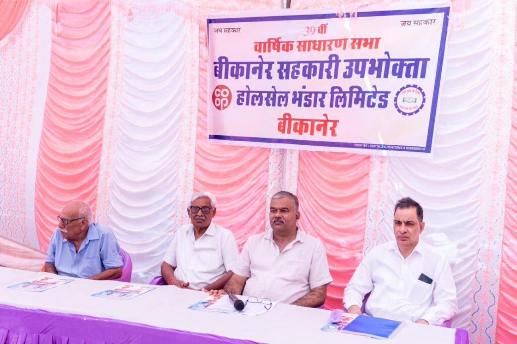 बीकानेर सहकारी उपभोक्ता होलसेल भंडार की 39 वीं वार्षिक साधारण सभा सोमवार को भंडार प्रधान कार्यालय, “विजय सहकार भवन” में नगेन्द्रपाल सिंह शेखावत, अध्यक्ष की अध्यक्षता में आयोजित हुई। बैठक प्रारम्भ होने से पूर्व आमंत्रित सदस्यों द्वारा भंडार के पूर्व अध्यक्ष विजय सिंह बीदावत की प्रतिमा पर माल्यार्पण कर श्रद्धाजलि अर्पित की गई।भंडार के महाप्रबन्धक ने साधारण सभा के सभी सदस्यगण का स्वागत करते हुए भंडार के वार्षिक प्रतिवेदन को सदन के समक्ष प्रस्तुत किया तथा एजेंडा अनुसार वर्ष 2024-25 के लेखे प्रस्तुत किए। वर्ष 2025-26 के प्रस्तावित बजट पेश किया गया तथा किए गये खर्चों तथा लेखो का अनुमोदन तथा पुष्टि आमसभा सदस्यों द्वारा सर्व सम्मति से की गई। अध्यक्ष ने अपने अध्यक्षीय उद्बोधन के दौरान बताया कि भंडार सहकारिता की मूल भावना के अनुरुप बिना लाभ हानि के सिद्धांतों पर अपने उपभोक्ताओं को गुणवत्ता युक्त उच्च क्वालिटी की सामग्रीयों उचित मूल्य पर उपलब्ध करवाता है।