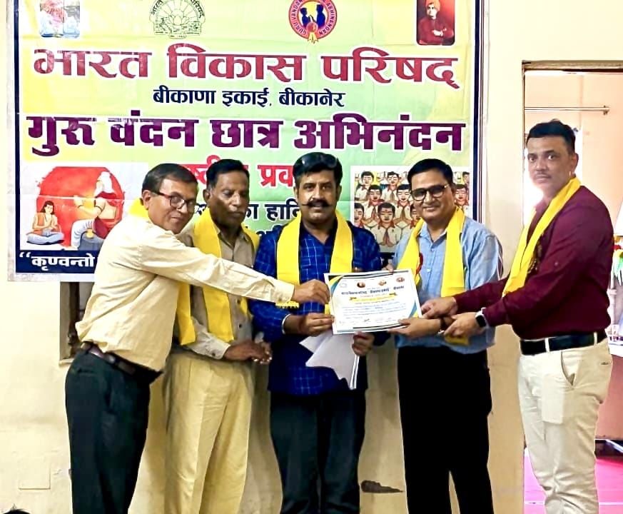 भारत विकास परिषद, बीकाणा इकाई द्वारा आज एक्सीलेंस अकादमी विद्यालय, मुक्ता प्रसाद कॉलोनी में परिषद का राष्ट्रीय प्रकल्प गुरु वंदन छात्र अभिनंदन कार्यक्रम का आयोजन किया गया।