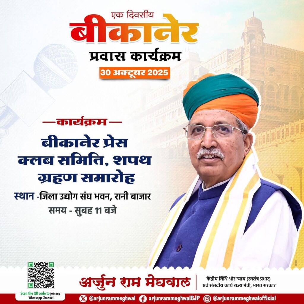 बीकानेर 29 अक्टूबर 2025। बीकानेर जिले में प्रिंट, इलेक्ट्रोनिक एवं डीजीटल मीडिया के माध्यम से पत्रकारिता की मशाल को जलाए रखने वाले 215 पत्रकारों की सदस्यता वाले बीकानेर प्रेस क्लब का शपथ ग्रहण समारोह गुरूवार 30 अक्टूबर को आयोजित होगा। क्लब महासचिव विशाल स्वामी ने बताया कि कार्यक्रम में नवनिर्वाचित पदाधिकारियों एवं मनोनीत कार्यसमिति सदस्यों द्वारा शपथ ली जाएगी। कार्यक्रम में मुख्य अतिथि के रूप में केन्द्रीय कानून मंत्री अर्जुनराम मेघवाल मौजूद रहेगें एवं कार्यक्रम की अध्यक्षता वरिष्ठ पत्रकार मधु आचार्य करेगें। कार्यक्रम में विशिष्ट अतिथि के रूप में जिले के विधायक ताराचंद सारस्वत, जेठानंद व्यास, अंशुमानसिंह भाटी, सिद्धी कुमारी, डॉ विश्वनाथ मेघवाल, सुशीला डूडी एवं राज्य सरकार के कैबीनेट मंत्री सुमित गोदारा को आमंत्रित किया गया है। रानी बाजार स्थित जिला उद्योग संघ के भवन में सुबह 10.30 बजे से शुरू होने वाले इस कार्यक्रम के पश्चात सभी पत्रकारों का स्नेहभोज भी आयोजित किया जाएगा।