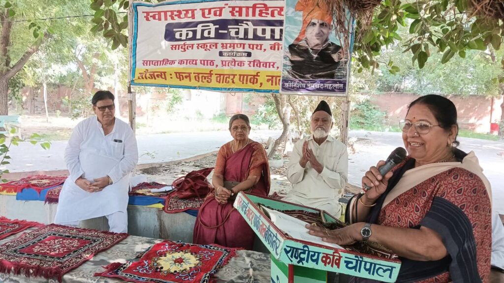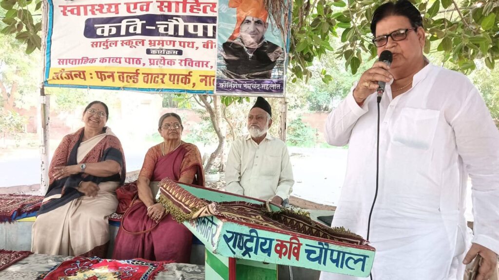 पर बिना ‘‘अर्थ-समृद्धि’’ के सिद्धि किस काम की। सिद्धहस्त की सफल कृतियां.. बन जाती है बिन दाम की.. राजकुमार ग्रोवर : पूर्व वाले जाने हैं रिश्तों की कदर, पश्चिम में कोई नहीं पूछता कौन है फादर कौन मदर,.. लीलाधर सोनी : जीवण रा दिन चार, जागति ज्यौति है,… विशाल भारद्वाज : राष्ट्रीय कवि चौपाल में वर्षों से हो रही, नेमीचंद जी को समर्पित हर रचना हो रही, मोहम्मद शकील गौरी : बरसे बिरखा मुसलाधार, म्हारो कद आसी भरतार। इंया कियां पड़े पार मरसी आ थारी गजनार,… शानदार रचना सुना कर वाह वाह लूंटी